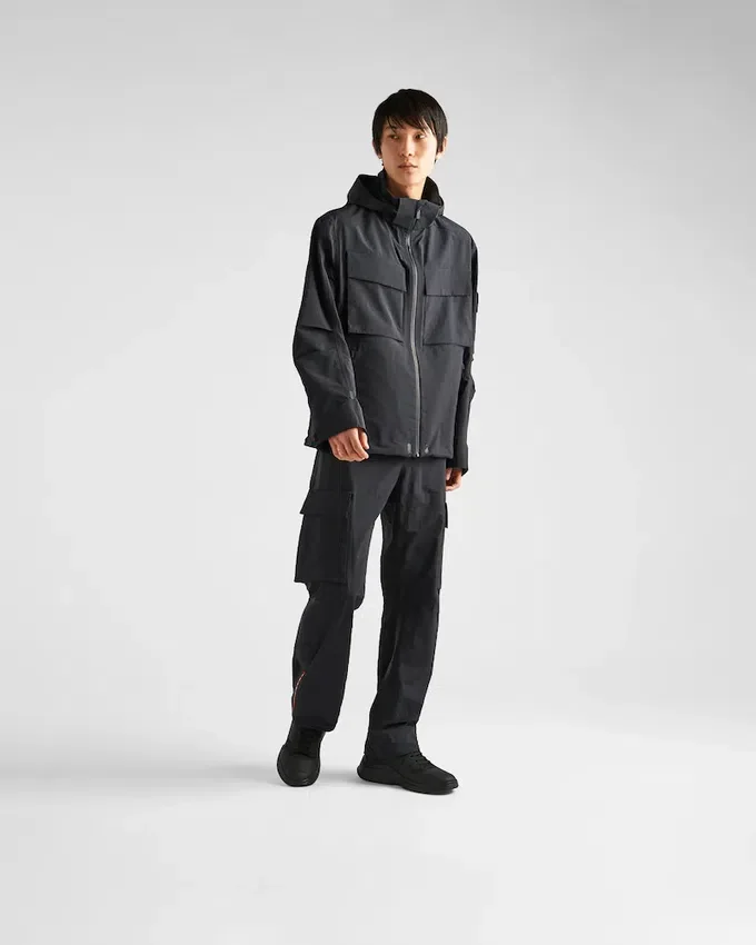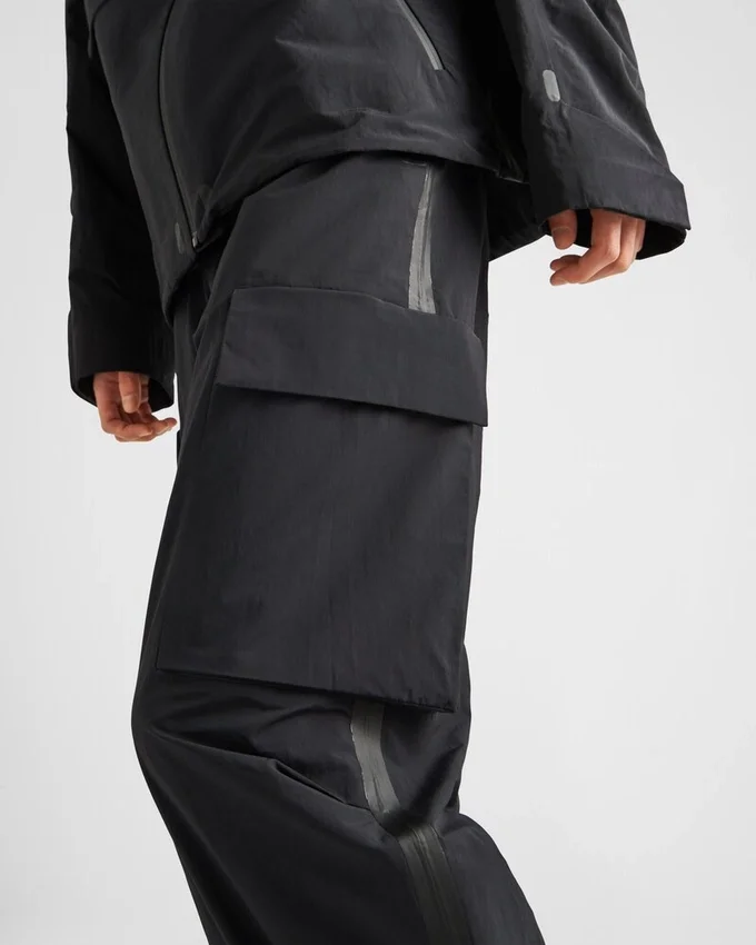 このワイドパンツは、伸縮性のあるウエストバンドやジッパー付きの伸縮性のある裾など、スポーツ界に由来するディテールが特徴です。軽量なテクニカルファブリックで作られており、プラダの象徴的な「リネア・ロッサ」のロゴがあしらわれています。