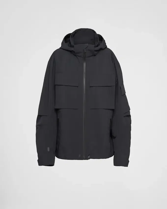 取り外し可能なフード付き、軽量テクニカルファブリック製のウィンドブレーカーです。テクニカルなワックス加工ジッパーが特徴の、シンプルでオーバーサイズのシルエットが際立ちます。伸縮性のあるドローストリングなどのスポーツウェアらしいディテールがアクセントとなり、アイコニックなプラダ リネア・ロッサのロゴがあしらわれています。