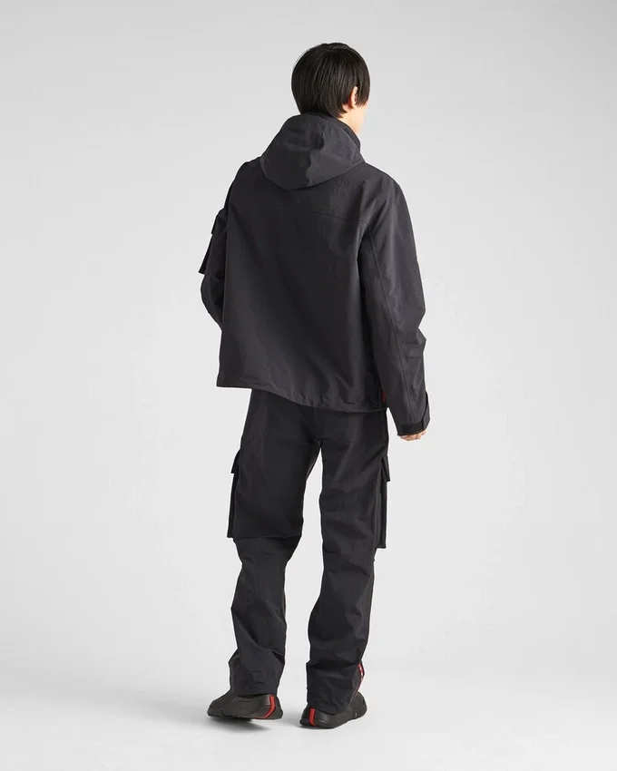取り外し可能なフード付き、軽量テクニカルファブリック製のウィンドブレーカー。テクニカルなワックス加工ジッパーが特徴の、シンプルでオーバーサイズのシルエットです。伸縮性のあるドローストリングなどのスポーツウェアのディテールがアクセントとなり、プラダ リネア・ロッサの象徴的なロゴがあしらわれています。