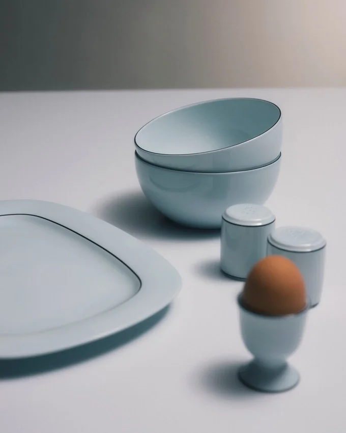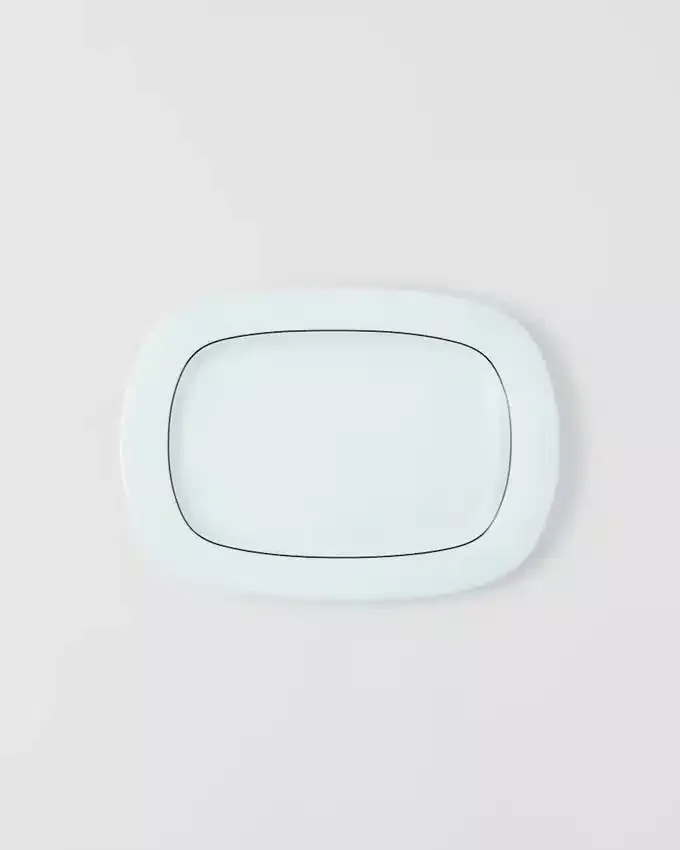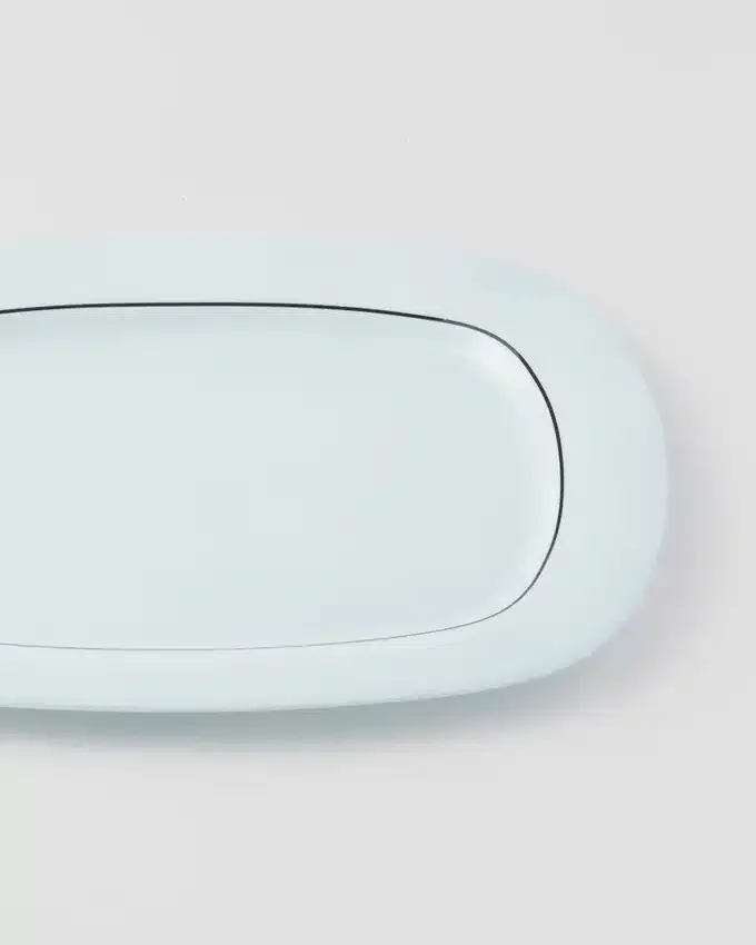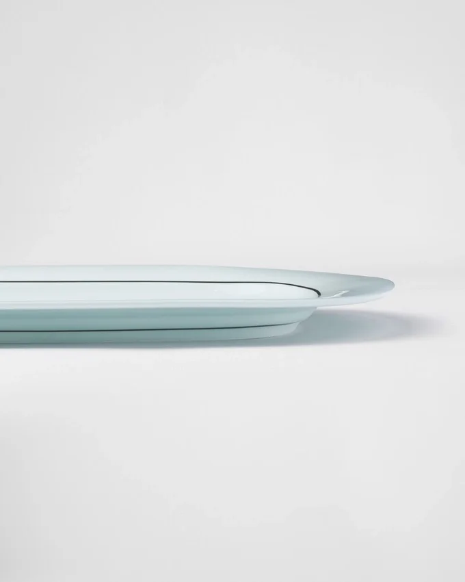 極上の釉薬を施した磁器で作られたこの長方形トレイは、職人の技とPRADAの美的コードを融合させた、洗練されたモダンなデザインです。日本の古式青磁からインスピレーションを得たこのアイテムは、手描きで施された縁取りがアクセントとなり、象徴的で繊細なニュアンスを醸し出しています。