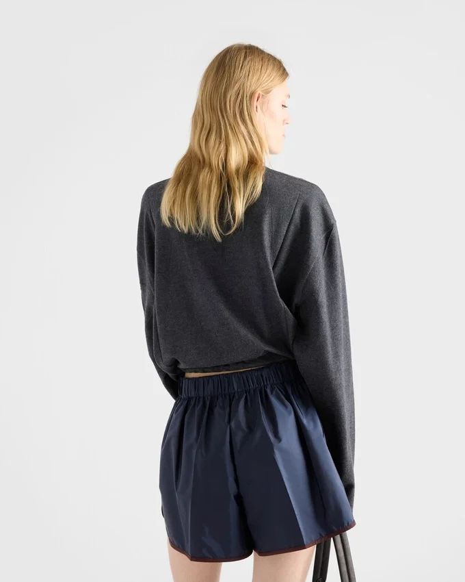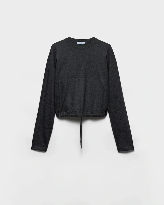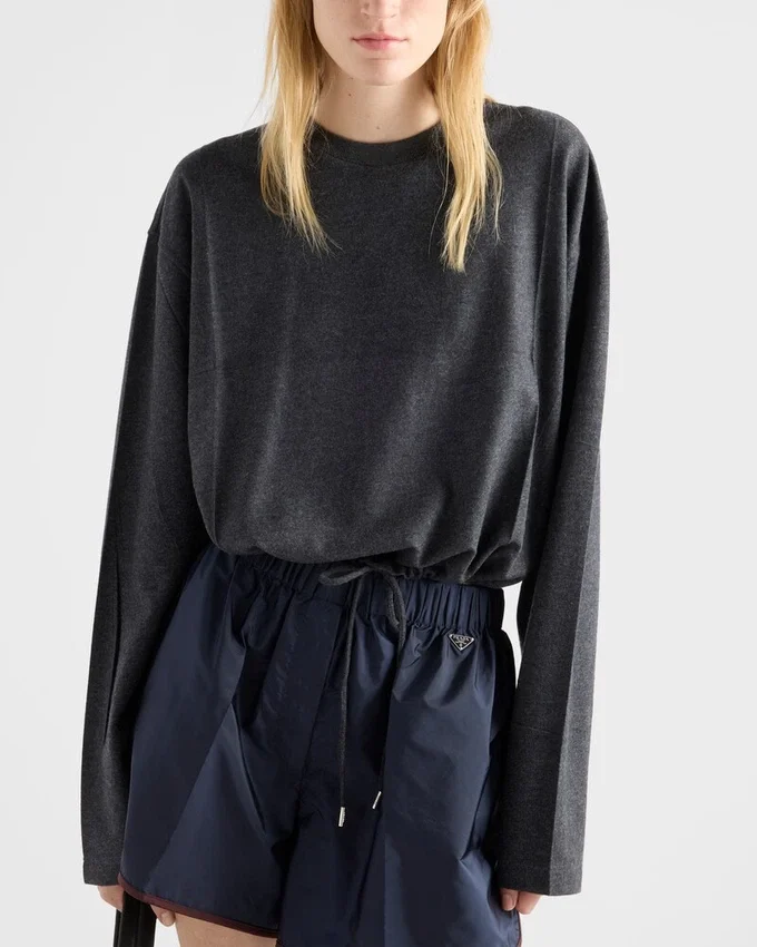 このウール&カシミアジャージーTシャツは、スポーティーなディテールをあしらったカジュアルなデザインです。ドローストリング付きの裾が特徴のソフトなシルエットに、同系色のトライアングルロゴがあしらわれています。