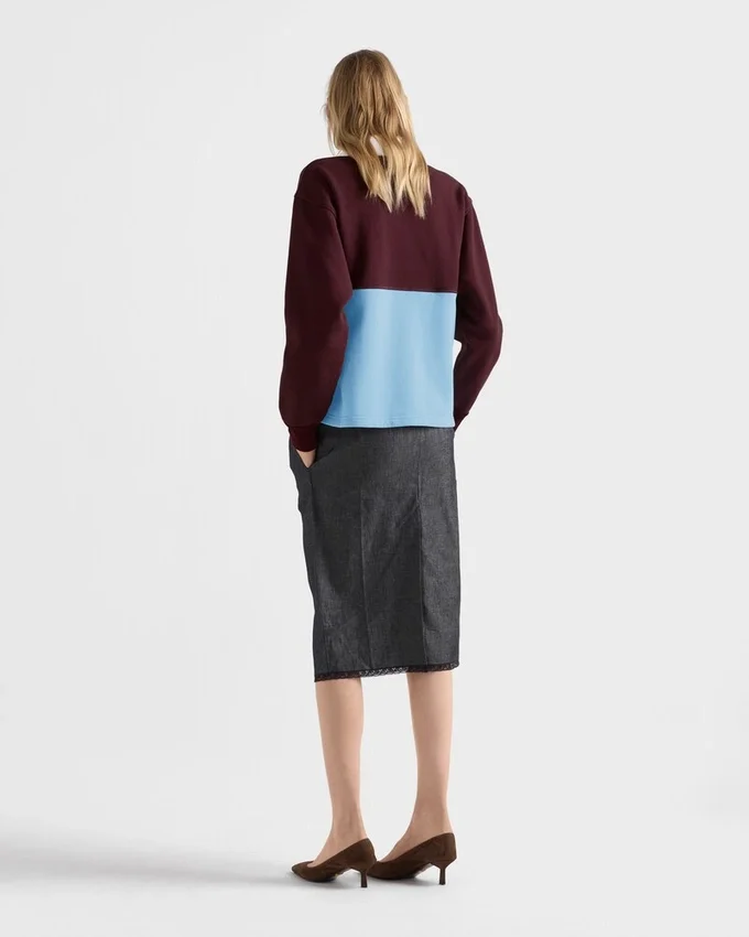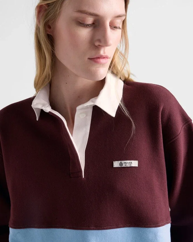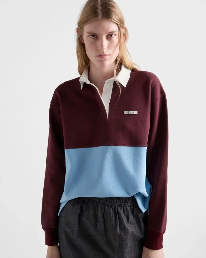 カラーブロックデザインが特徴のこのポロシャツは、レトロなスポーツムードと、フロントのロゴラベルやオーバーサイズのモダンなシルエットといったPRADAならではのディテールを融合させています。