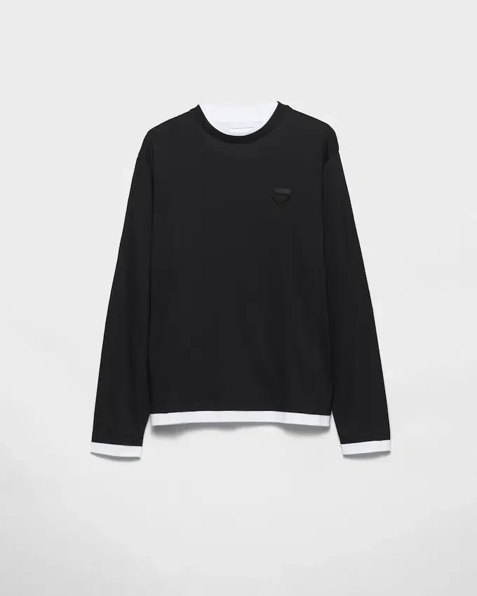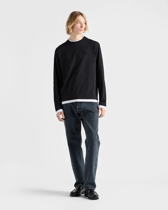 このコットンTシャツは、レイヤードとコントラストの演出により、カジュアルなシルエットに現代的なタッチを加えています。