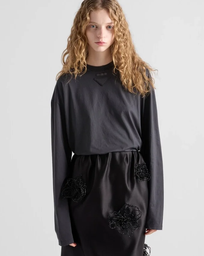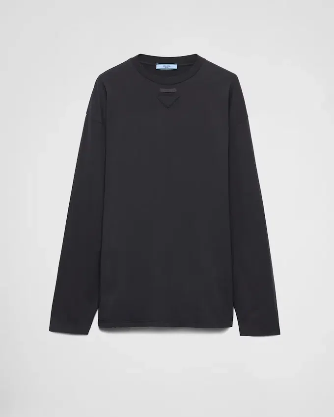 ワードローブの定番アイテムである長袖Tシャツを、オーバーサイズでリラックスしたシルエットと現代的なスタイルで再解釈しました。ヴィンテージ風の仕上げを施したガーメントダイのジャージー素材を使用し、クルーネックのシルエットは、仕立てのラベルと象徴的な三角形のファブリックロゴによって完成されています。
