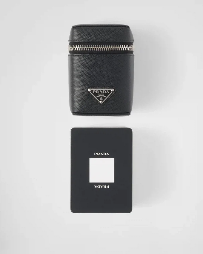 このトランプセットには3組のデッキが含まれており、Pradaの象徴的な素材の一つであるSaffianoレザー製の洗練されたケースに収められています。Saffianoレザーは、スクラッチ加工とワックス仕上げが施された極めて高品質なカーフスキンです。エナメル加工されたメタル製の三角ロゴが、このアクセサリーを完成させています。
