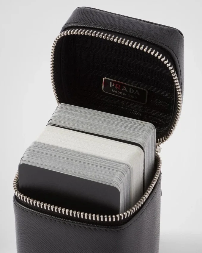 このトランプセットには3組のカードが含まれており、Pradaの象徴的な素材の一つであるSaffianoレザー製の洗練されたケースに入っています。Saffianoレザーは、スクラッチ加工とワックス仕上げが施された極めて高品質なカーフスキンです。エナメル加工されたメタル製のトライアングルロゴが、このアクセサリーを引き立てています。