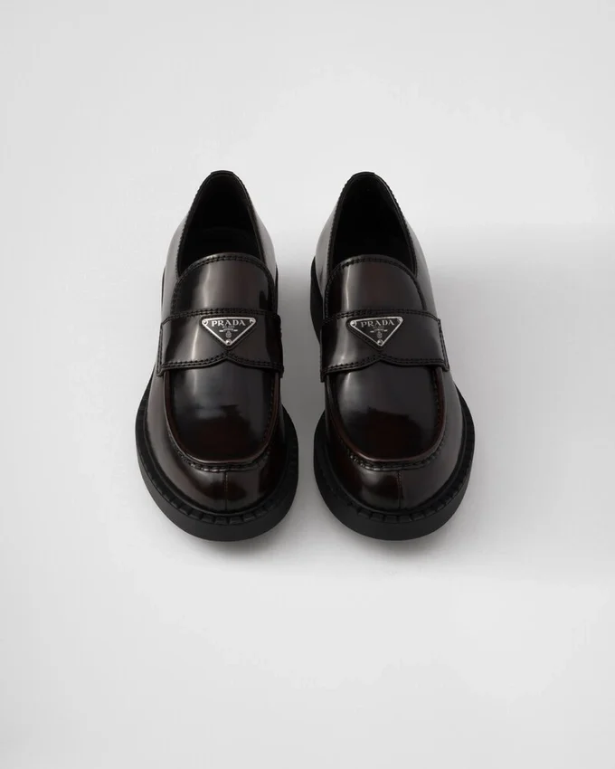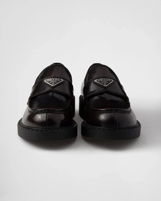 クラシックで男性的なローファーが、新たなボリューム感と洗練されたディテールで再デザインされました。ブランドの象徴的な素材であるブラッシュドレザーを使用し、三角形のロゴ、ステッチの施されたエッジ、そしてラバーソールに施された特別なパターンで装飾されています。