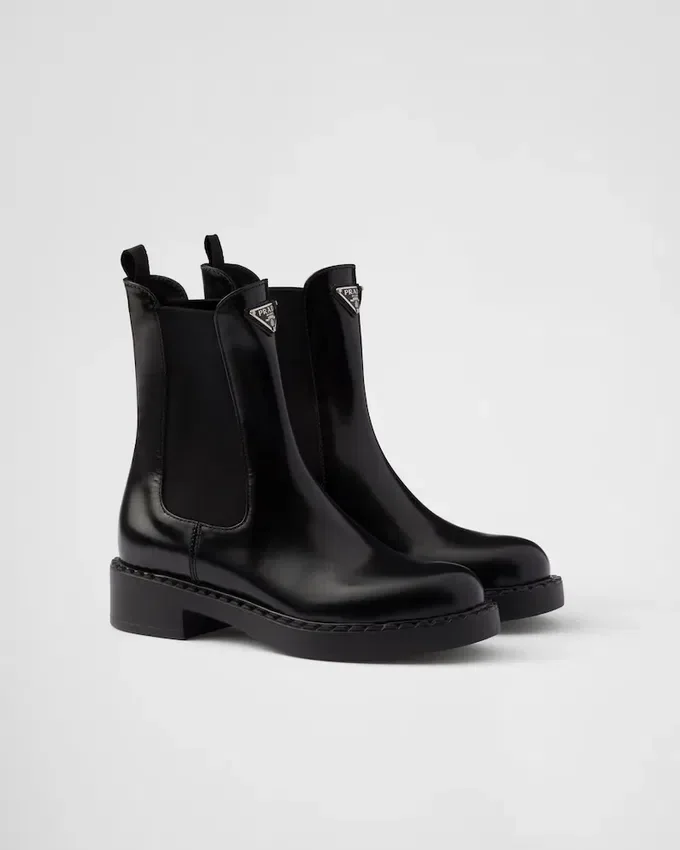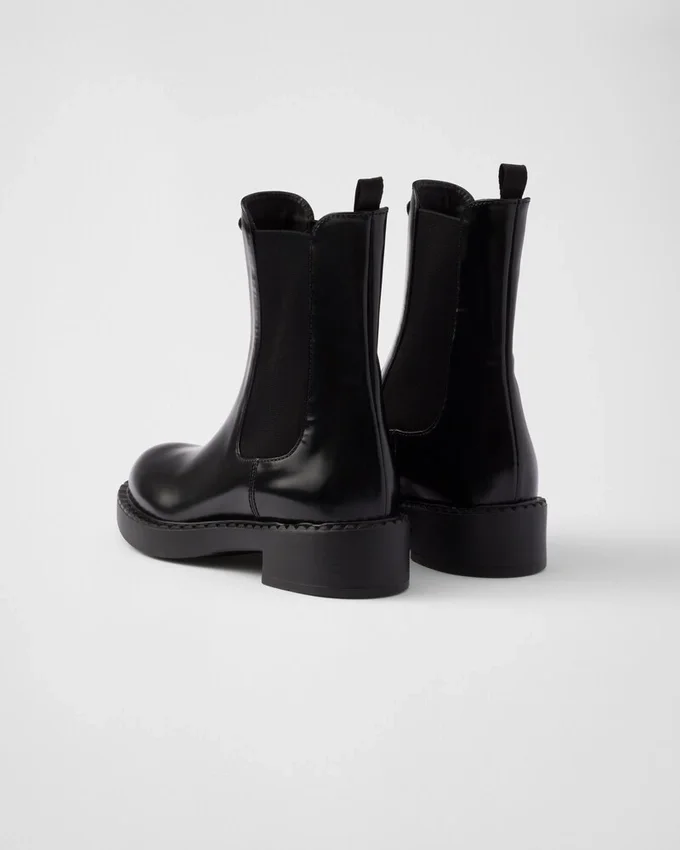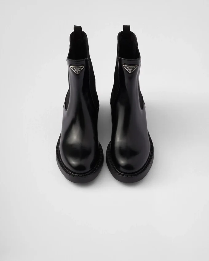 Pradaコレクションの象徴的な素材の一つであるブラッシュドレザーを使用した、クリーンなラインが特徴のモダンなシルエットのチェルシーブーツです。カジュアルな雰囲気と洗練された魅力を兼ね備えた汎用性の高いデザインで、快適なラバーソールが仕上げられています。エナメル加工されたメタル製の三角ロゴが、シンプルでありながら際立つシグネチャーとしてスタイルを引き立てています。