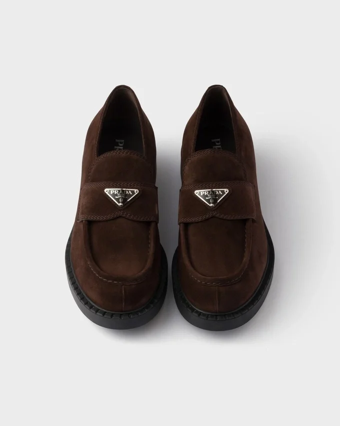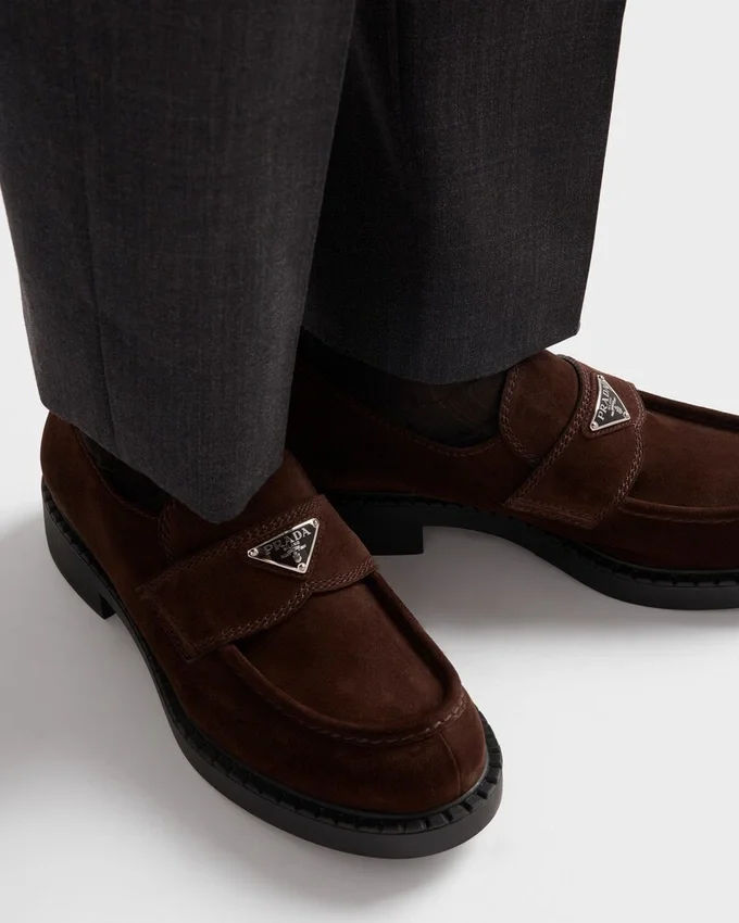 プラダの世界観を象徴するデザインであるChocolateローファーは、汎用性の高い現代的なスタイルを体現しています。このハイブリッドなスタイルは、クラシックな素材とディテールに、モダンなボリューム感を持つシルエットを組み合わせ、特徴的な軽量ラバーソールで彩られています。スエード素材と、エナメル加工されたメタル製の三角ロゴが、このシューズに新たな個性を与えています。