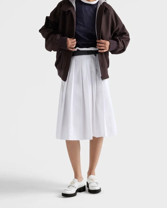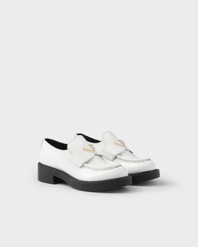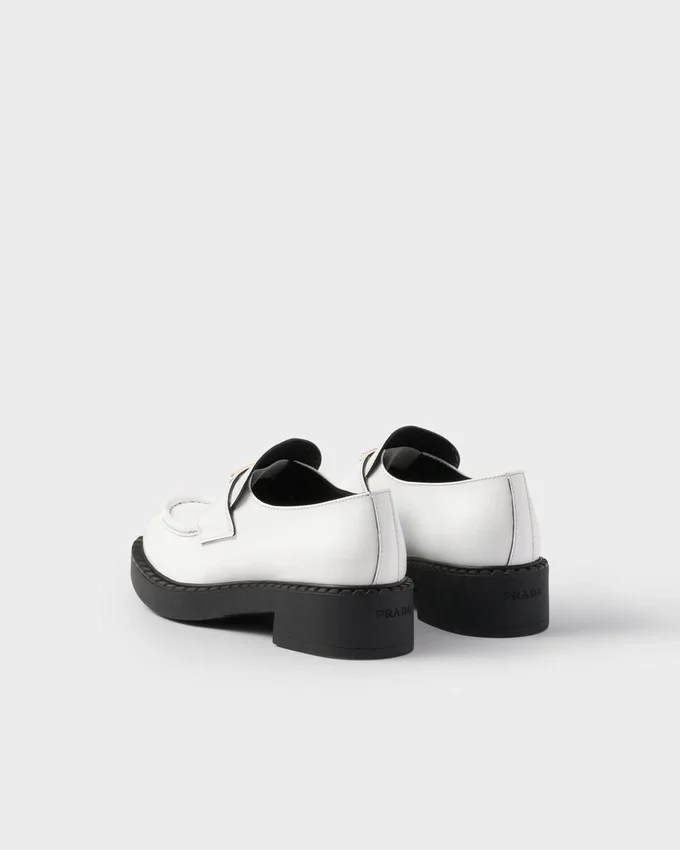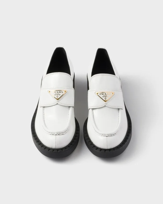 Pradaの世界観を象徴する「Chocolateローファー」は、汎用性が高く洗練されたスタイルを体現しています。このハイブリッドなシルエットは、クラシックな素材やディテールと、ラバーソールのモダンなボリューム感との対比が特徴です。