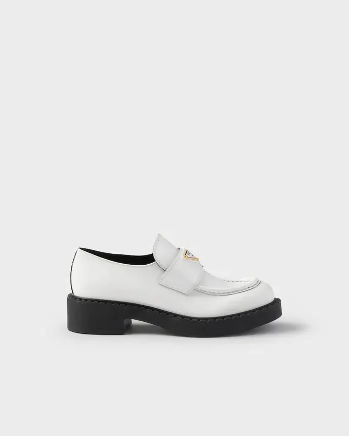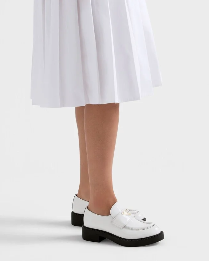 Pradaの世界観を象徴する「Chocolateローファー」は、汎用性が高く洗練されたスタイルを体現しています。このハイブリッドなシルエットは、クラシックな素材やディテールと、ラバーソールのモダンなボリューム感との対比が特徴です。パテントレザーのエレガントで光沢のある仕上げがスタイルを引き立て、象徴的なエナメル加工メタル・トライアングル・ロゴが全体を完成させています。
