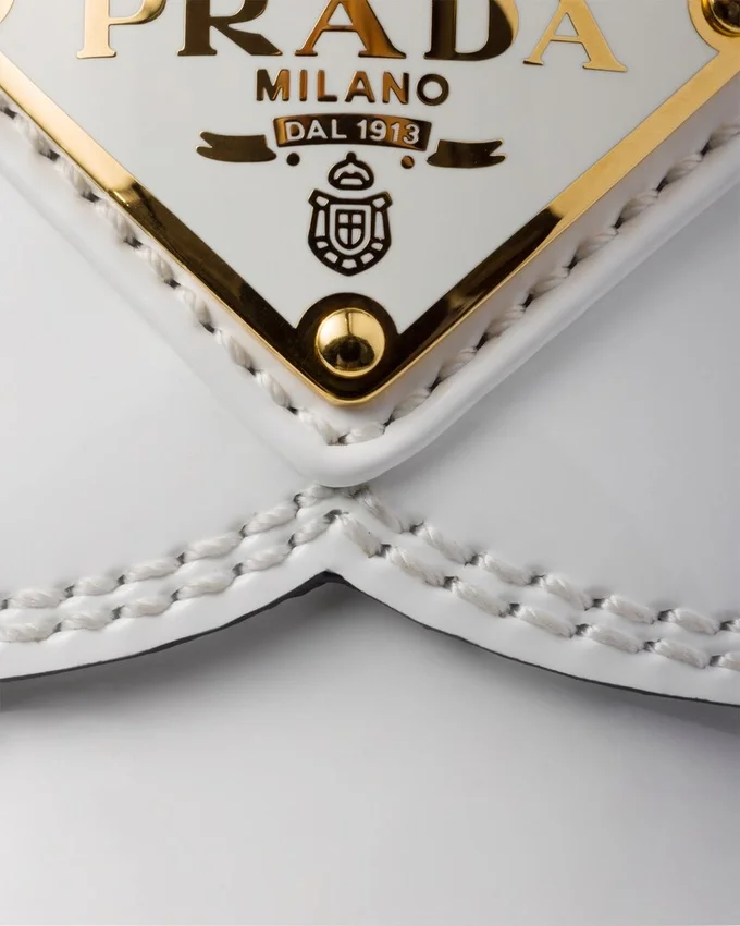 パテントレザーのエレガントで光沢のある仕上げがスタイルを引き立て、象徴的なエナメル加工のメタルトライアングルロゴが完成度を高めています。