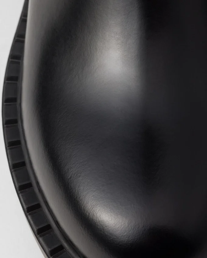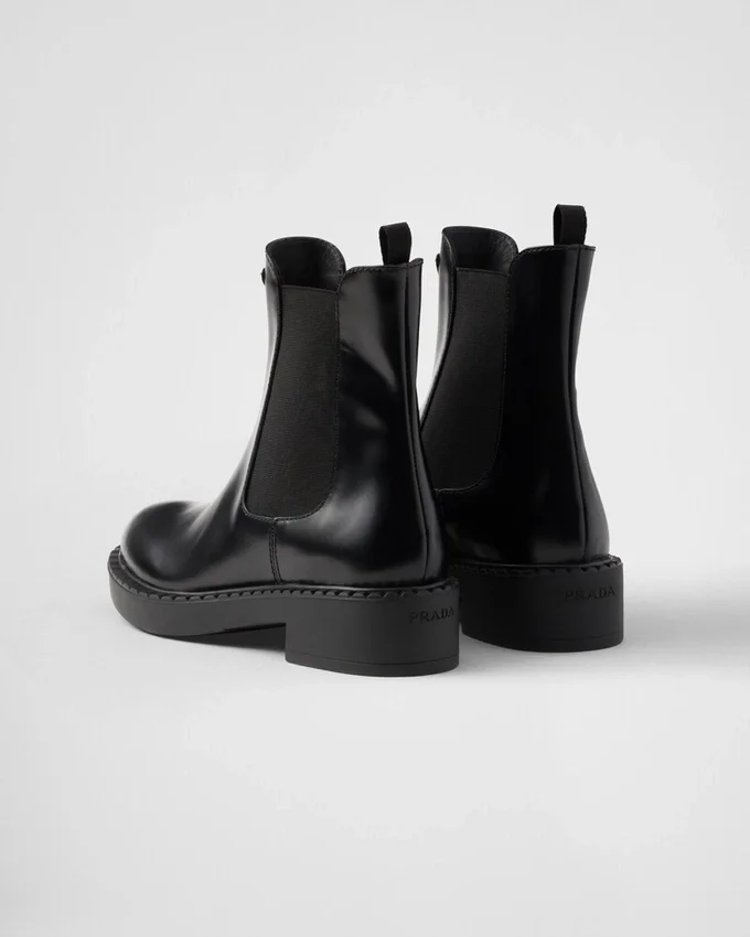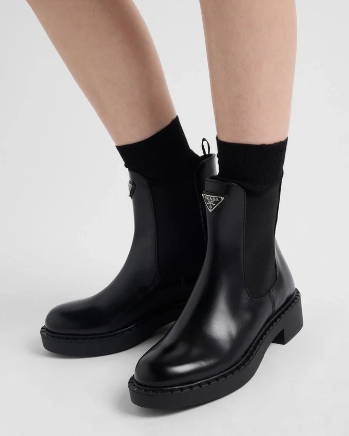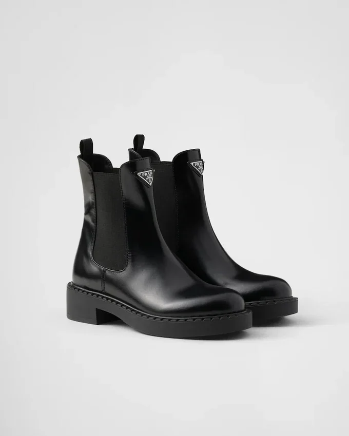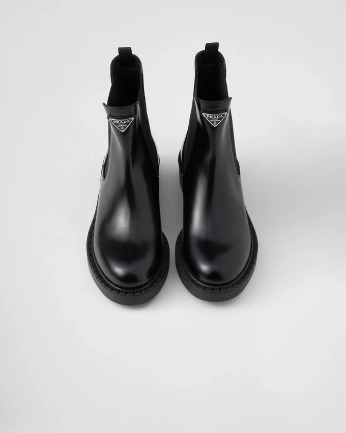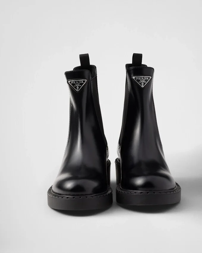 このブラッシュドレザーのブーティは、伸縮性のあるサイドガセットと、アッパーに際立つエナメル加工のメタル製トライアングルロゴが特徴です。