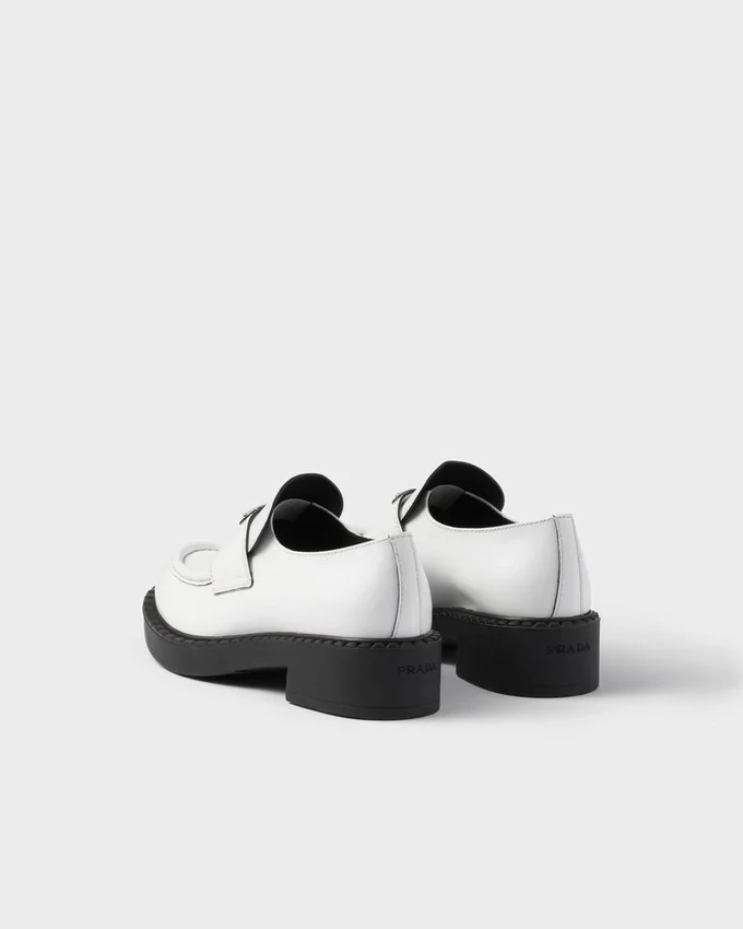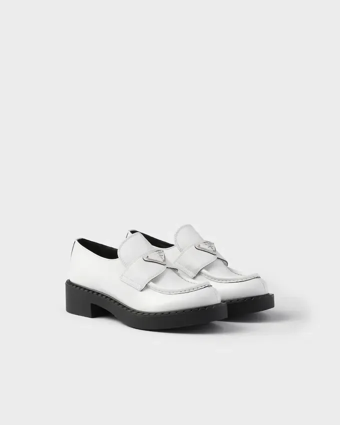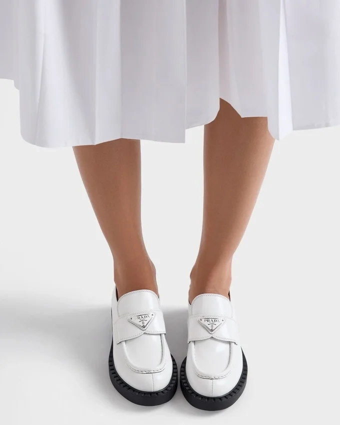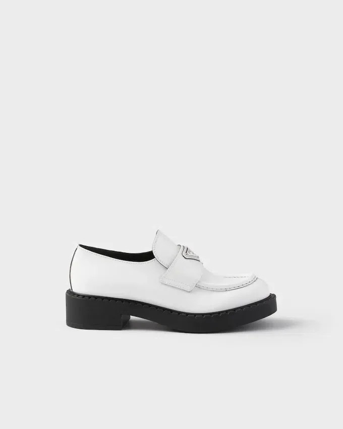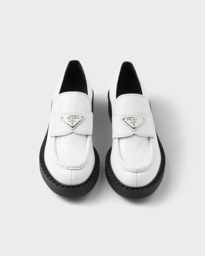 象徴的なエナメル加工の三角ロゴが際立つ、レトロなインスピレーションを受けたこのローファーは、伝統的な高級靴に用いられるブラッシュドレザーを使用しています。Pradaのコレクションでは、予想外のデザインで再解釈され、ブランドの二面性を反映したハイブリッドな仕上がりとなっています。靴の周囲を囲むウェルトのノッチ加工が、ハンドメイドの風合いを演出しています。