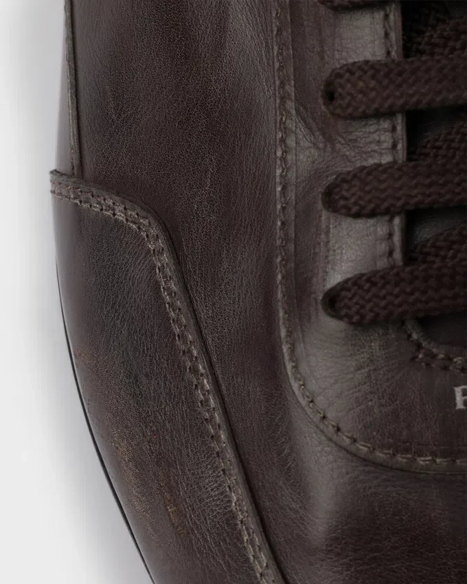「Collapse」スニーカーの軽やかなデザインは、PRADAのスポーティで職人技あふれる精神を体現しています。ヴィンテージ加工を施したレザー製のこのシューズは、シルエットの柔らかさと柔軟性を強調する薄いソールと伸縮性のあるサイドによって、その魅力をさらに引き立てています。