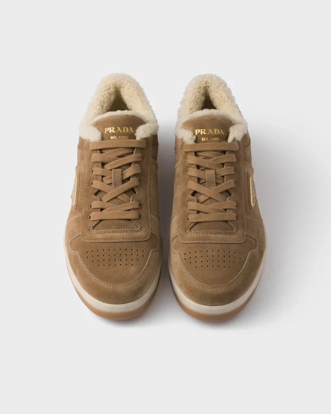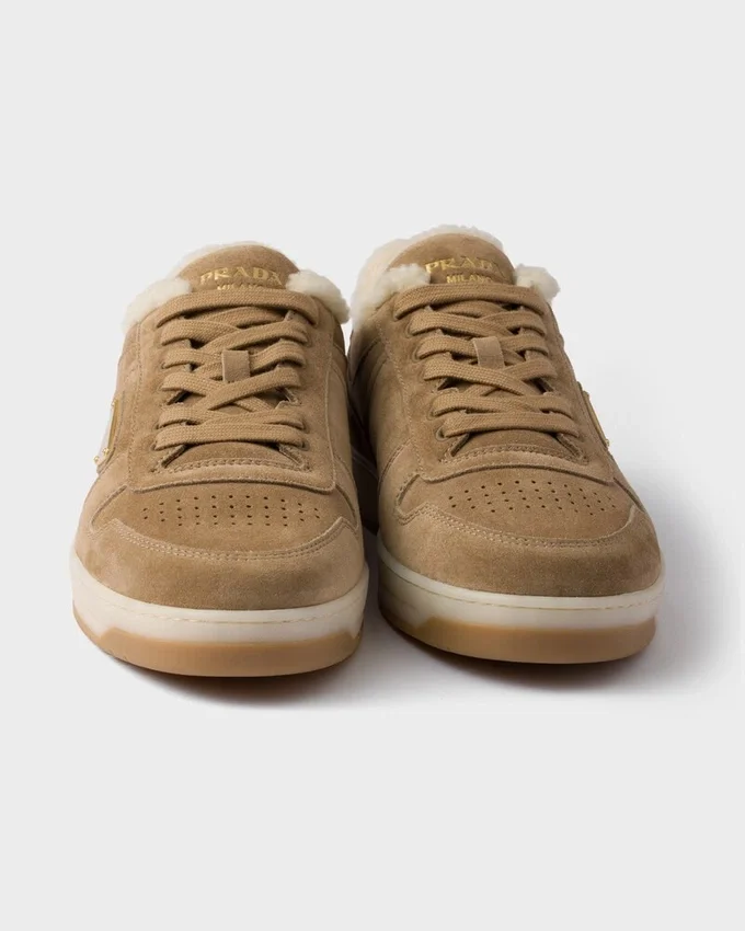 バスケットボールシューズからインスピレーションを得た「Downtown スニーカー」は、スポーティなデザインと、個性的で洗練されたディテールが際立つ一足です。様々なバージョンのPradaロゴをあしらったこのアイコニックなスタイルは、スエード製で、柔らかなシープスキンライニングが施されています。
