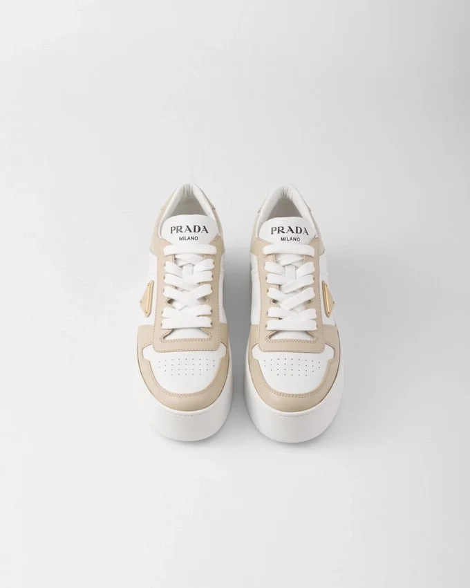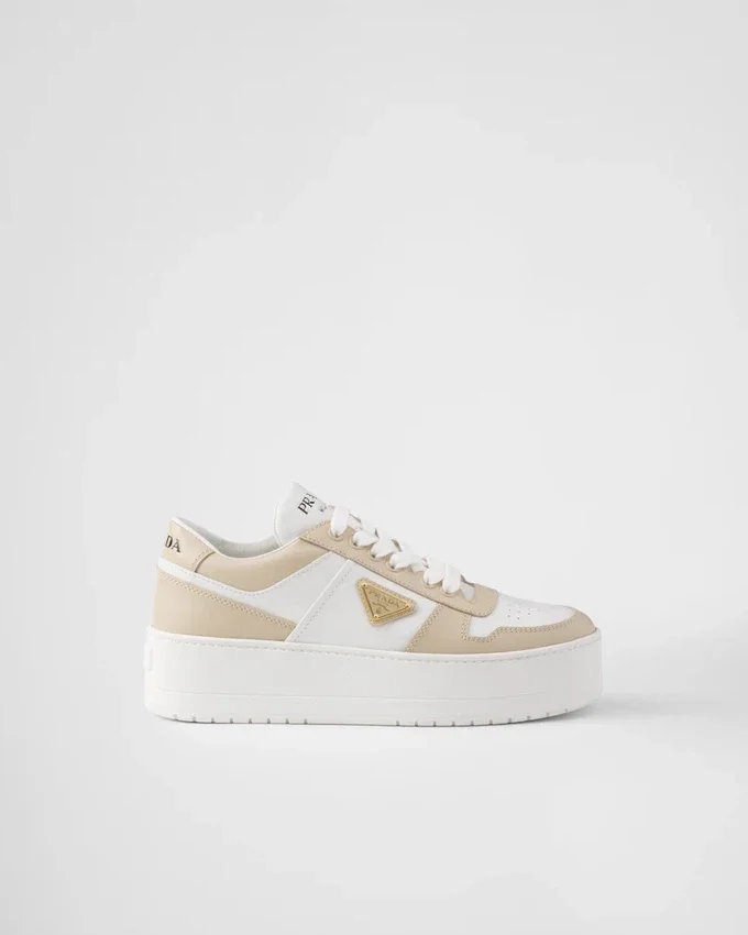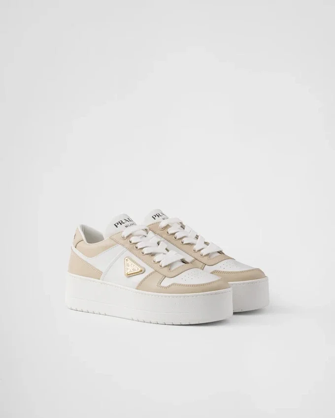 1980年代のバスケットボールスニーカーからインスピレーションを得たこの「Downtown ボールド」スニーカーは、スポーティなデザインに洗練されたディテールが施されています。 ツートーンのパーフォレーテッドレザーを使用したこのシューズは、フラットフォームソールを採用することで再解釈され、独特で現代的なキャラクターを醸し出しています。Pradaのロゴを様々な形であしらったデザインは、象徴的なエナメル加工メタルトライアングルの幾何学的な形状で仕上げられています。
