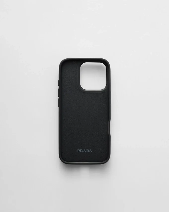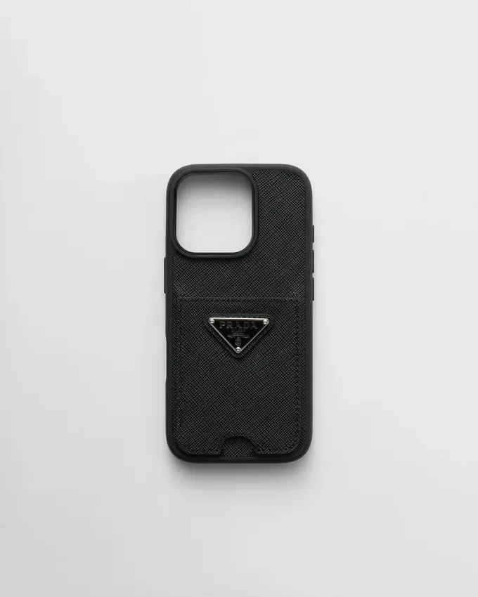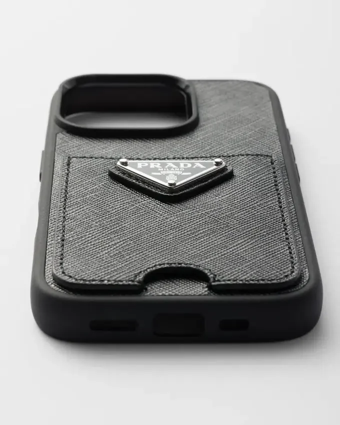 エレガンスと機能性を兼ね備えた、iPhone 16 Pro用Saffianoレザーケース。エナメル加工されたメタル製トライアングルロゴをあしらったカードホルダーポケットが特徴です。