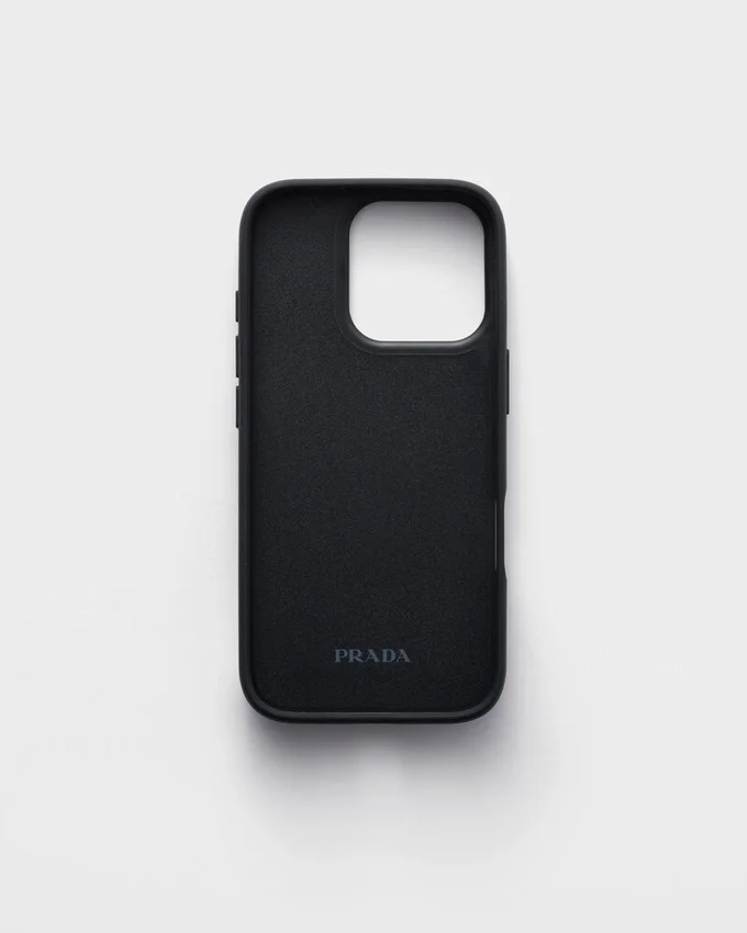 Saffianoレザー製のこのiPhone 16 Pro用ケースは、洗練されたスタイリッシュなデザインで、象徴的なエナメル加工の金属製トライアングルロゴがあしらわれています。