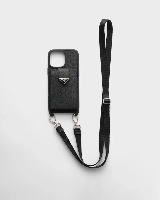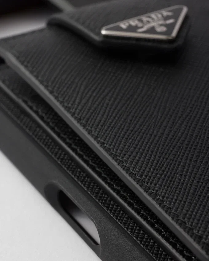 Pradaの象徴的な要素を融合させた、iPhone 16 Pro Max用ケース。洗練されたモダンなエレガンスが特徴です。独特のクロスハッチ模様とワックス加工が施された上質なSaffianoレザーがデザインを際立たせ、エナメル加工のメタル製トライアングルロゴと付属のカードホルダーがアクセントを添えています。