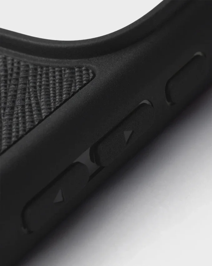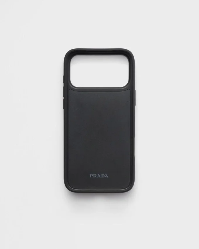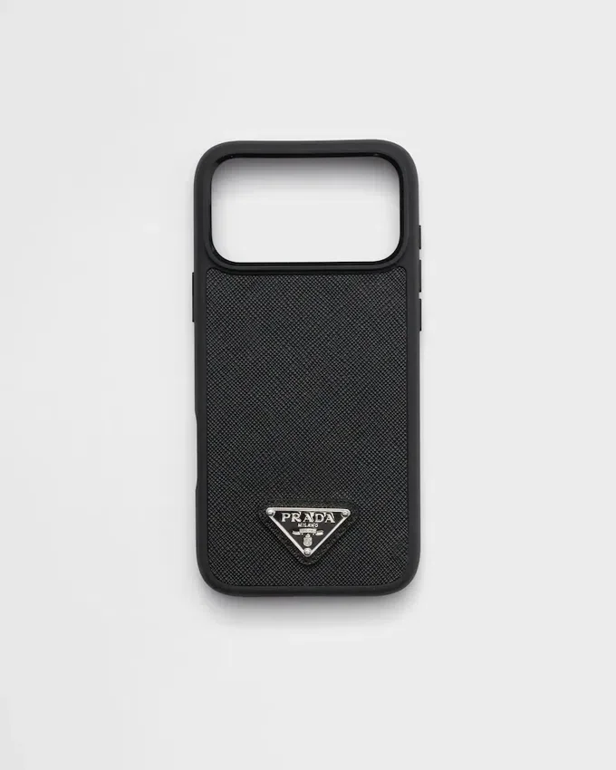 特徴的なクロスハッチのテクスチャーとワックス仕上げが特徴の象徴的なSaffianoレザーが、トライアングルロゴをあしらったこのiPhone 17 Pro Max用エレガントなケースを引き立てます。