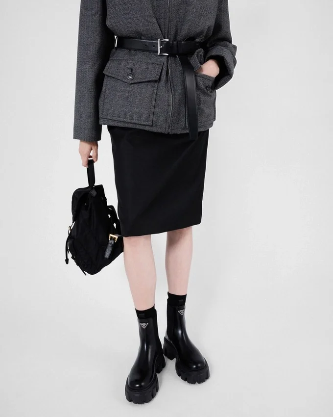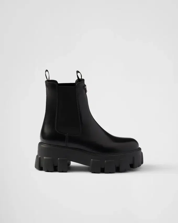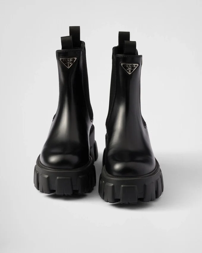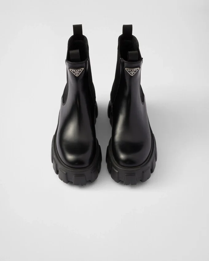 力強いラインと大胆なボリュームが、ブラッシュドレザー製のこのチェルシーブーツのシルエットを形作っています。Pradaの二面的な美学を表現したハイブリッドデザインは、幾何学的でモダニズム的な特徴を持つ独自のMonolithソールによって強調され、このシューズにユニークなタッチを加えています。