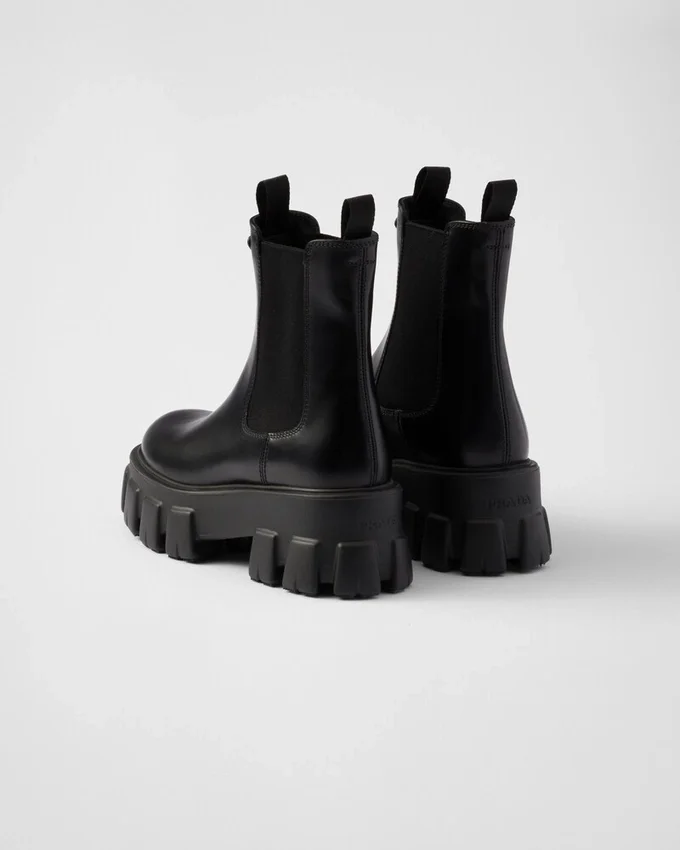 力強いラインと大胆なボリュームが、ブラッシュドレザー製のこのチェルシーブーツのシルエットを形作っています。Pradaの二面的な美学を表現するハイブリッドなデザインは、幾何学的でモダニズム的な特徴を持つ独自のMonolithソールによって強調され、シューズにユニークなタッチを加えています。