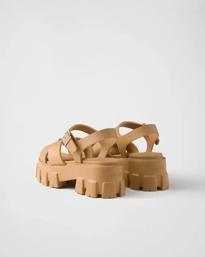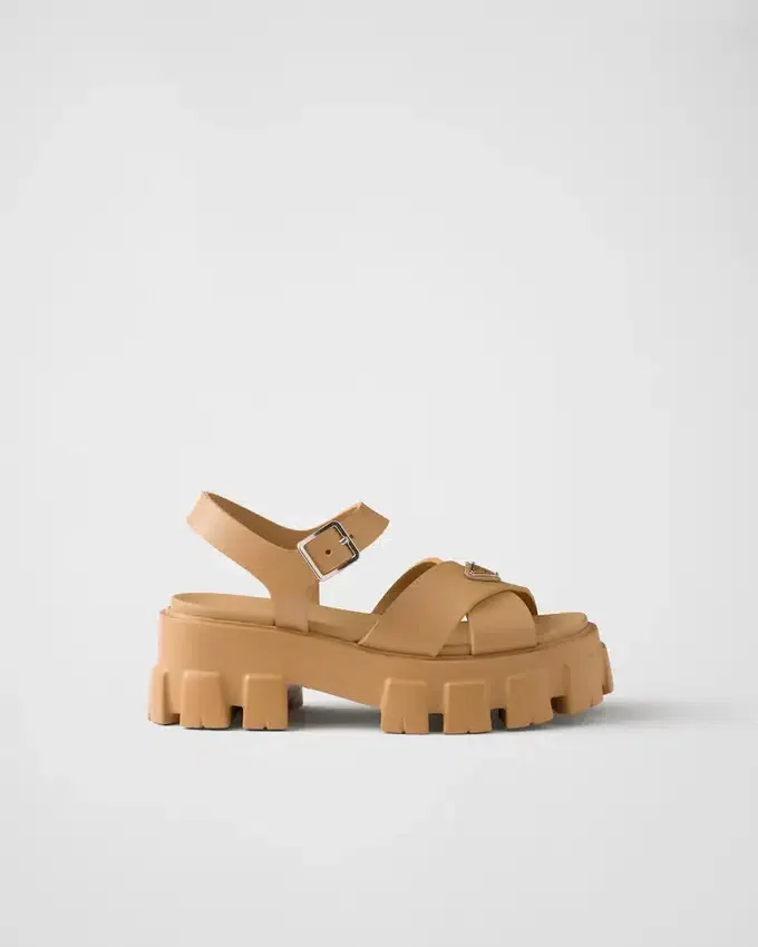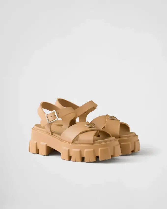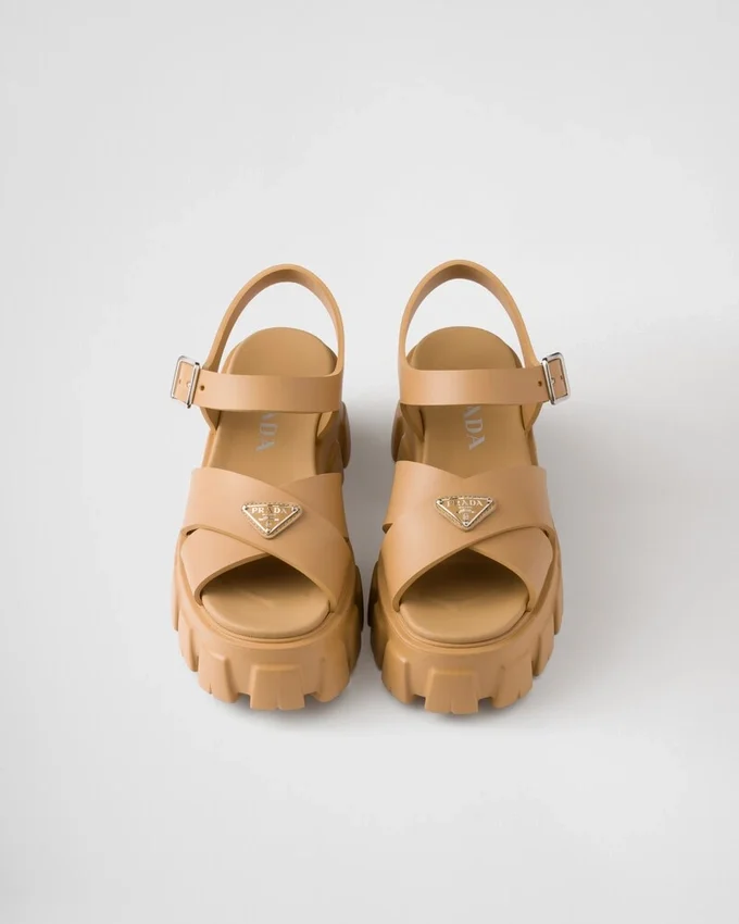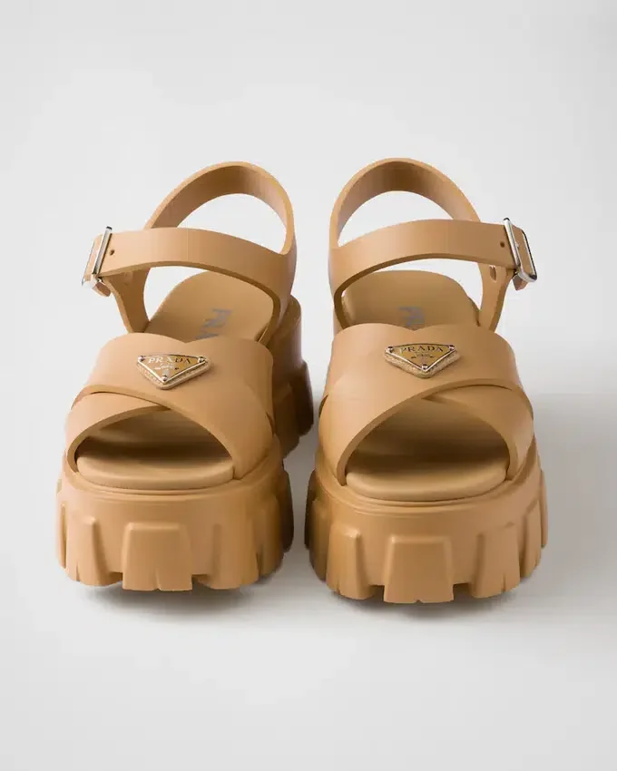 スポーティーなタッチと現代的なディテールを備えたこのラバーサンダルは、Pradaの型破りで二面性のある精神を象徴しています。特徴的なMonolithソールが際立つこのスタイルは、エナメル加工されたメタル製トライアングルロゴという象徴的なシグネチャーによって完成されています。