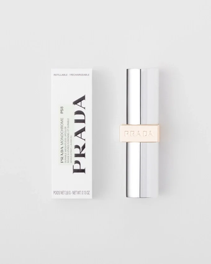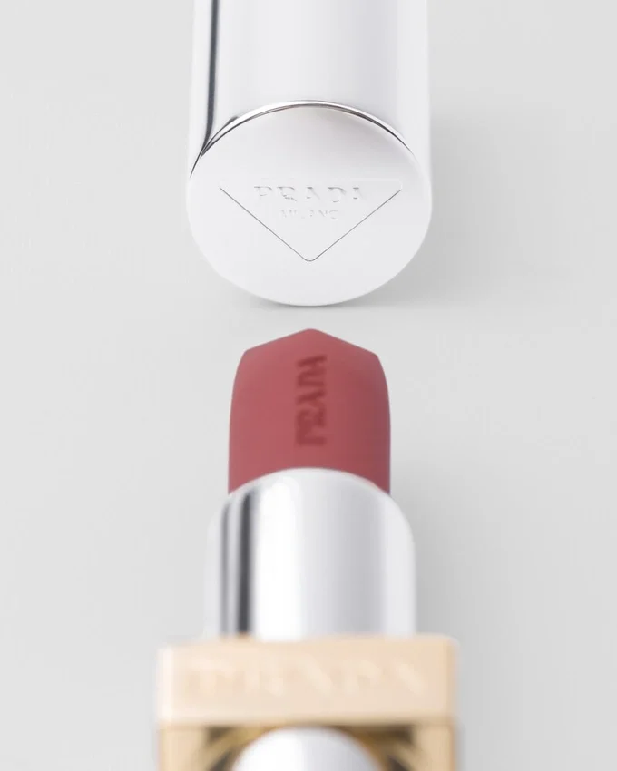 Prada モノクローム リップカラーは、唇に滑らかに馴染み、一日中軽やかな付け心地を保ちます。ハイパーマット レンジは、ブラックベースとわずか3種類の純粋な顔料のみを配合した濃密なカラーパレットで、Saffianoレザーの高度な発色と深みを再現します。