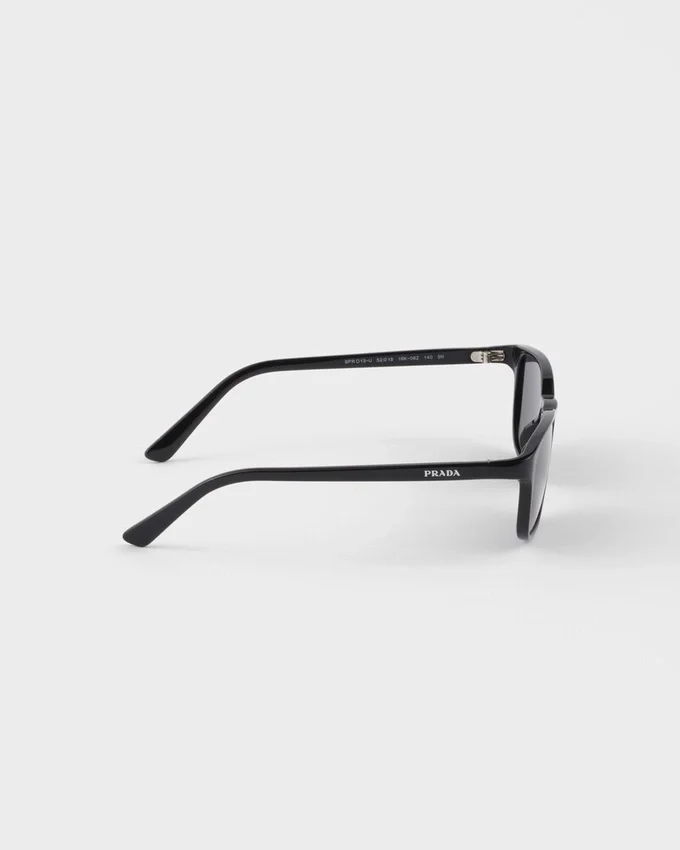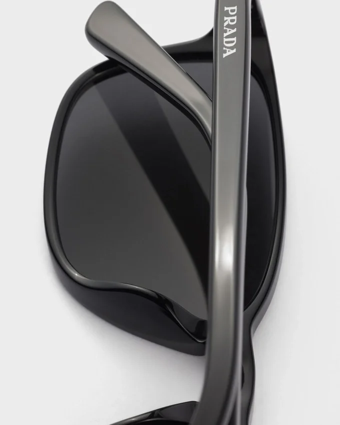 2026年春夏ランウェイショーで披露されたサングラスは、現代的なひねりを加えたレトロなエレガンスを表現しています。長方形のアセテートフレームは、スリムで軽やかなラインが特徴で、モダンでミニマルなスタイルを体現しています。ストレートなテンプルには、エナメル加工されたPradaのレタリングロゴがシグネチャーとして施されています。