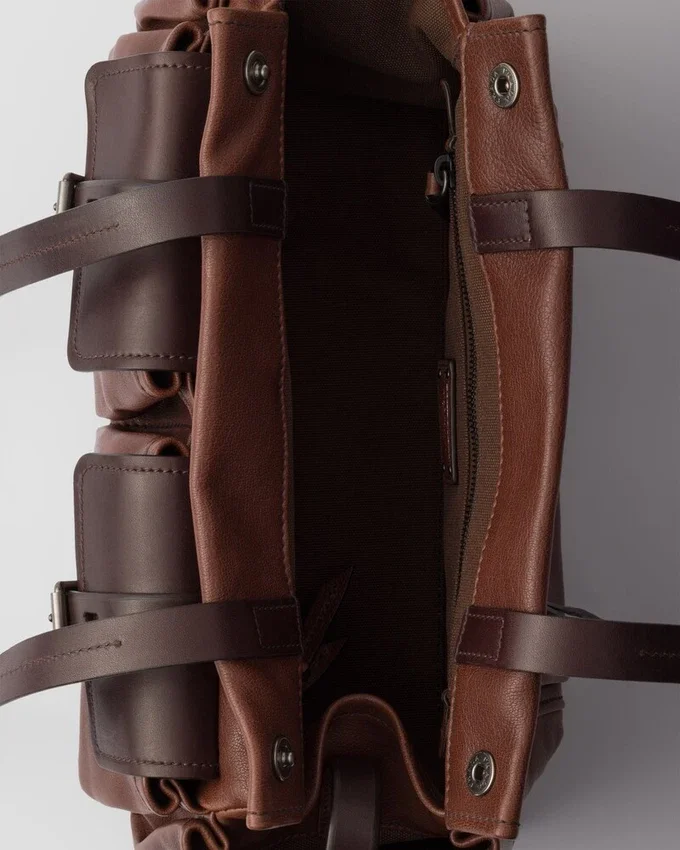 機能性と装飾性を兼ね備えたポケットが、ヴィンテージ仕上げのこのレザートートバッグのデザインにおける主役です。洗練さと汎用性を兼ね備え、広々とした容量でありながら洗練された美観を持つコンテンポラリーなスタイルは、特徴的なアーカイブのディテールを彷彿とさせるストラップとメタルバックルが特徴です。