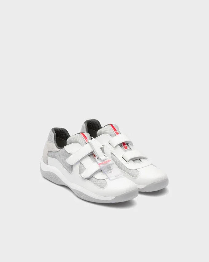 Pradaのヘリテージの一部である、1990年代にルナ・ロッサ・チームのために制作されたAmerica’s Cupスニーカーが、オリジナルスタイルと同じシルエット、ディテール、素材で再解釈されました。 セーリングの世界からインスピレーションを得たこのデザインは、柔らかくも耐久性に優れたレザーと、革新的な通気性のあるバイクファブリックを組み合わせ、オーバーサイズのラバーソールとダブルのマジックテープストラップで仕上げられています。プラダ リネア・ロッサのロゴがアイコニックなアクセントを加え、新しい「Beyond the Line」の取り外し可能なタグによってさらに強調されています。