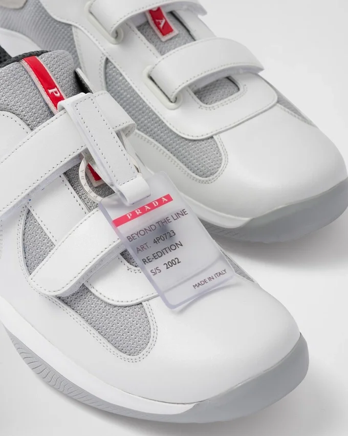 Pradaのヘリテージの一部である、1990年代にルナ・ロッサチームのために制作された「America’s Cupスニーカー」が、オリジナルスタイルと同じシルエット、ディテール、素材を継承し、新たな形で生まれ変わりました。 セーリングの世界からインスピレーションを得たこのデザインは、柔らかくも耐久性に優れたレザーと、革新的な通気性のあるバイク用ファブリックを組み合わせ、オーバーサイズのラバーソールとダブルのマジックテープストラップで仕上げられています。プラダ リネア・ロッサのロゴがアイコニックなアクセントを加え、新たに追加された「Beyond the Line」の取り外し可能なタグによって、その存在感がさらに際立っています。