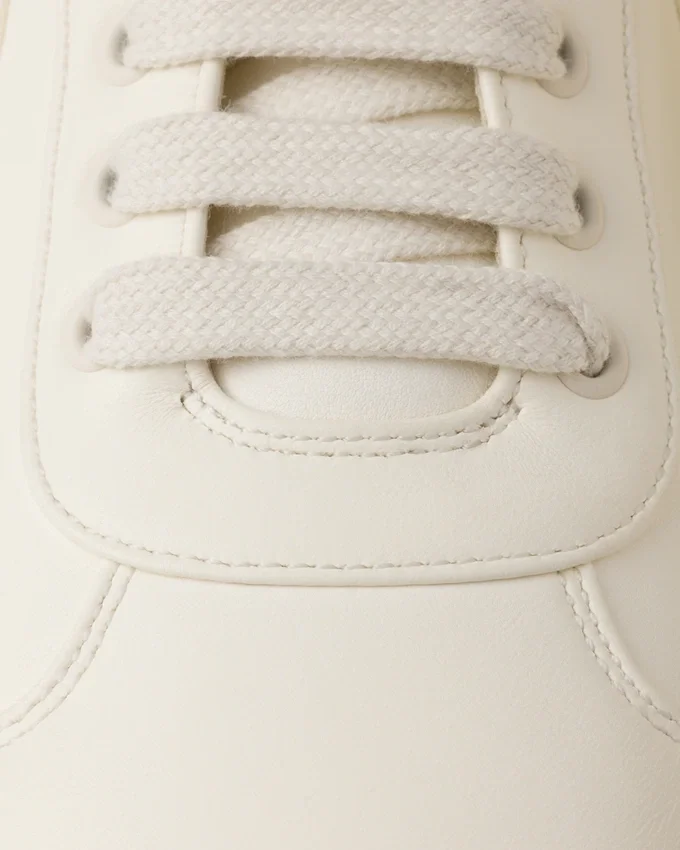 Pradaのアイデンティティの一部であり、1990年代にルナ・ロッサのクルーのためにデザインされた「America’s Cupスニーカー」が、オリジナルシューズのライン、ディテール、素材に着想を得たデザインで再提案されています。 セーリングの世界からインスピレーションを得たこのレースアップスタイルは、柔らかくも耐久性に優れたレザーと、革新的な通気性のあるバイク用ファブリックを組み合わせ、分厚いラバーソールで仕上げられています。