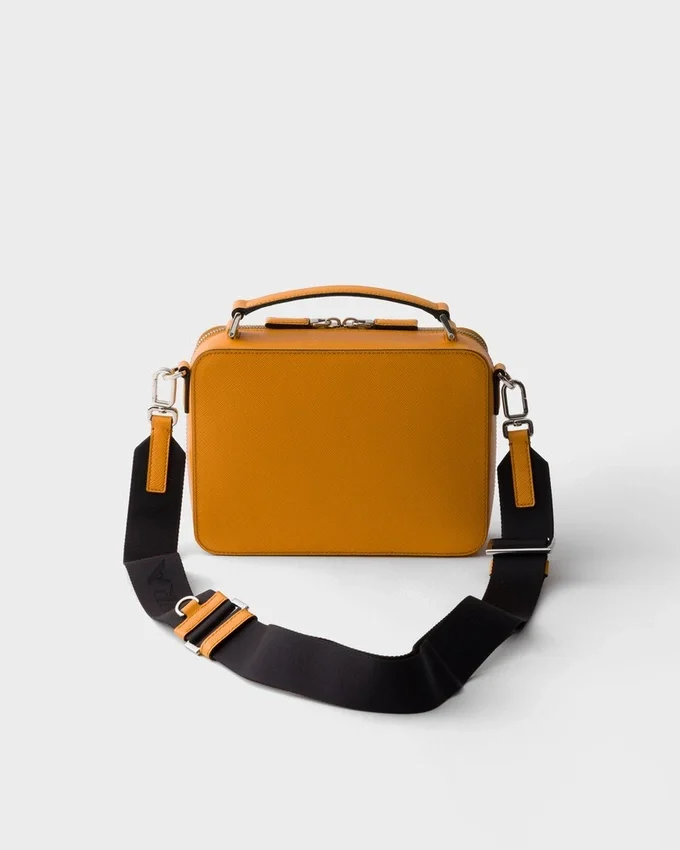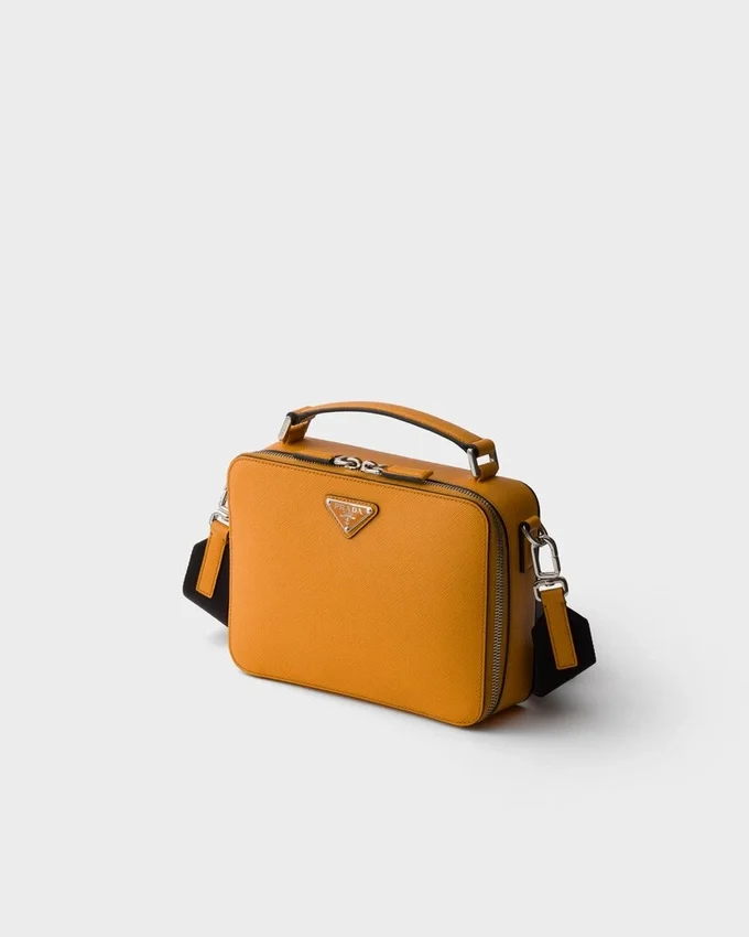 Saffianoレザー製のPrada Briqueバッグは、その洗練されたラインが際立っています。Pradaの象徴的な素材であるSaffianoレザーは、ラグジュアリーの代名詞であり、伝統的なイタリアのレザーグッズ製造を体現しています。