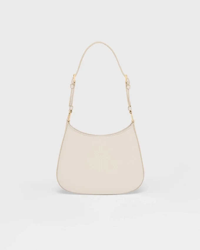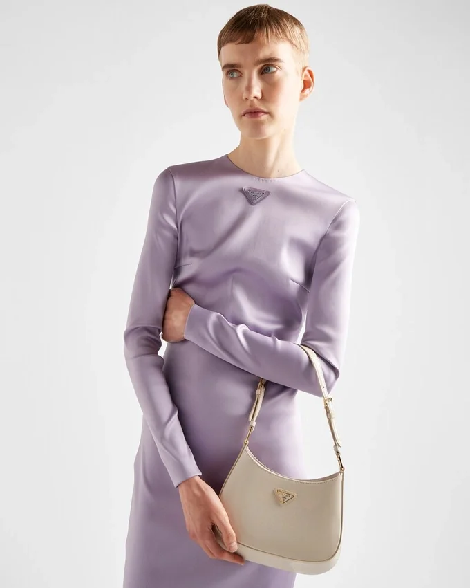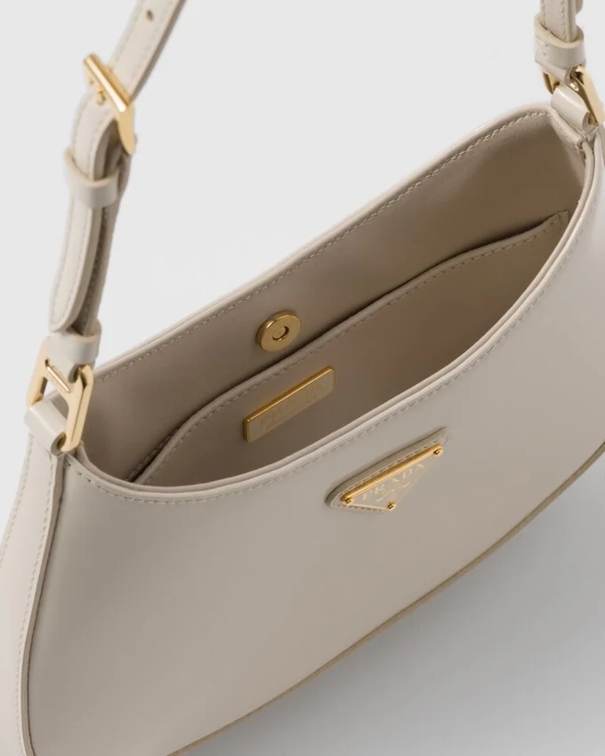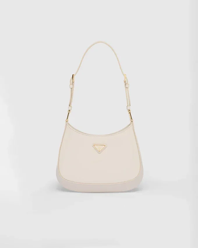 洗練された魅力を持つPrada Cleo バッグは、90年代のブランドの象徴的なデザインを再解釈したものです。底面と側面の特徴的な傾斜したシルエットによって強調された、滑らかで曲線的なラインが、このホーボーバッグに柔らかく軽やかな印象を与えています。このアクセサリーは、エレガントな光沢効果を生み出す独自のパテントレザーで作られています。