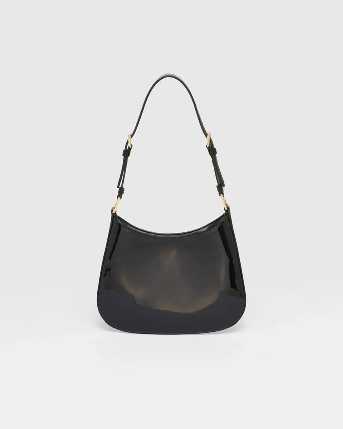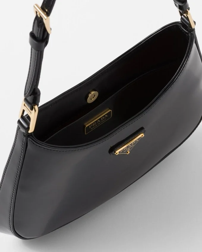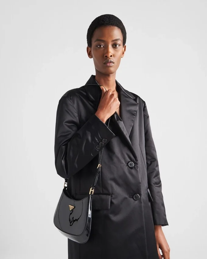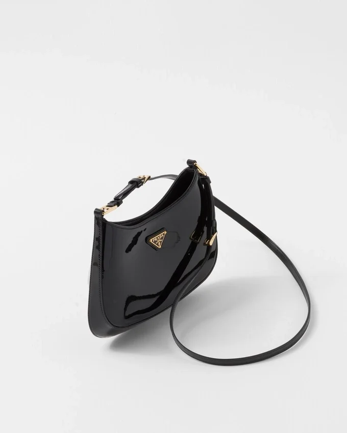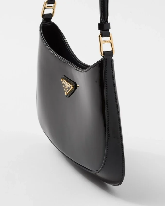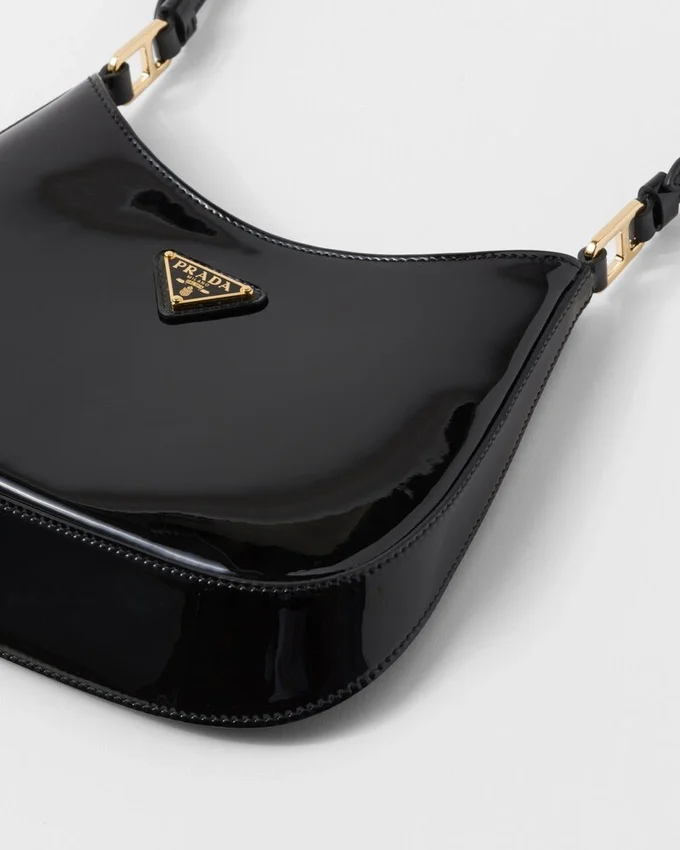 洗練された魅力を持つプラダ Cleo バッグは、90年代のブランドの象徴的なデザインを再解釈したものです。底面と側面の特徴的な傾斜したシルエットによって強調された、滑らかで曲線的なラインが、このホーボーバッグに柔らかく軽やかな印象を与えています。このアクセサリーは、エレガントな光沢効果を生み出す独自のパテントレザーで作られています。