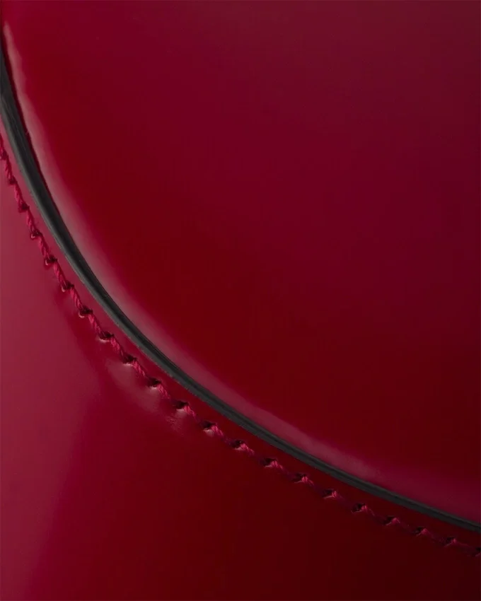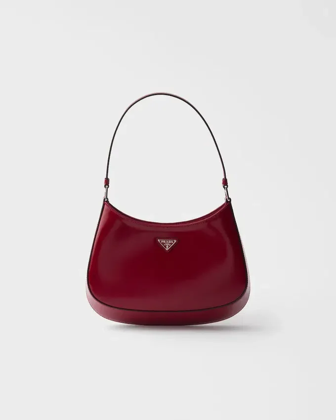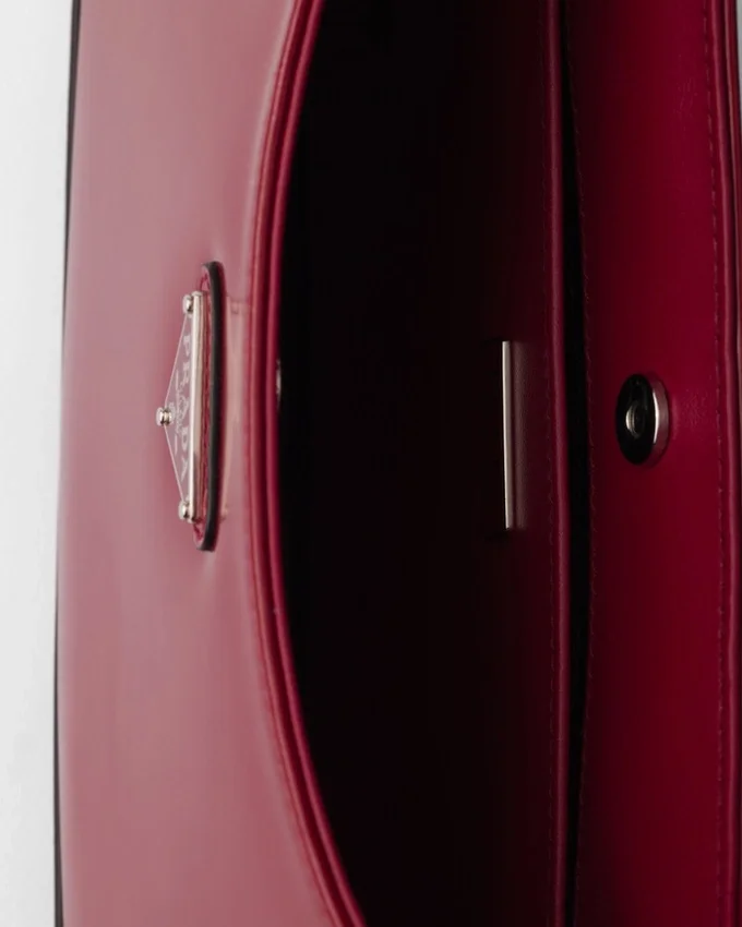 Pradaのコレクションにおいて特徴的な、モダンで汎用性の高い素材であるブラッシュドレザーは、常に新しい組み合わせやコントラストを生み出すのに最適です。エナメル加工された三角形のロゴがシルエットを彩ります。