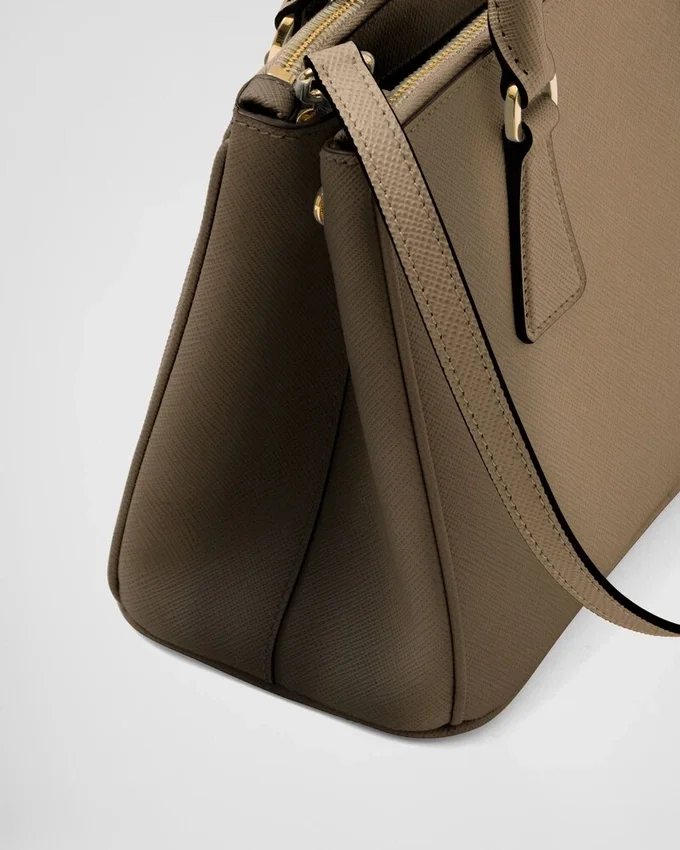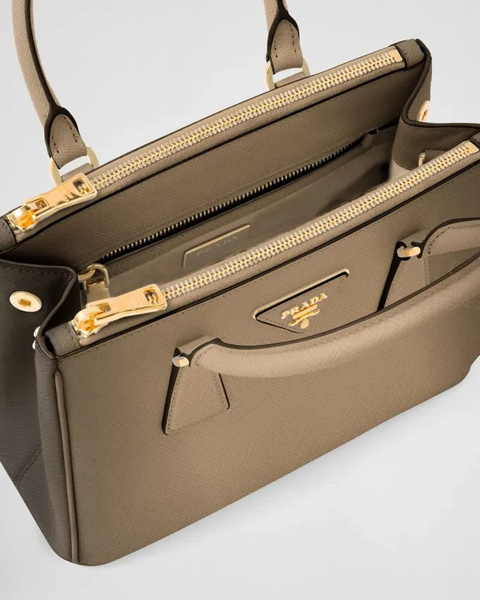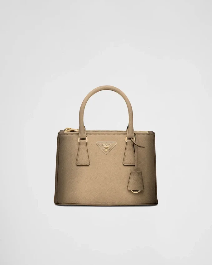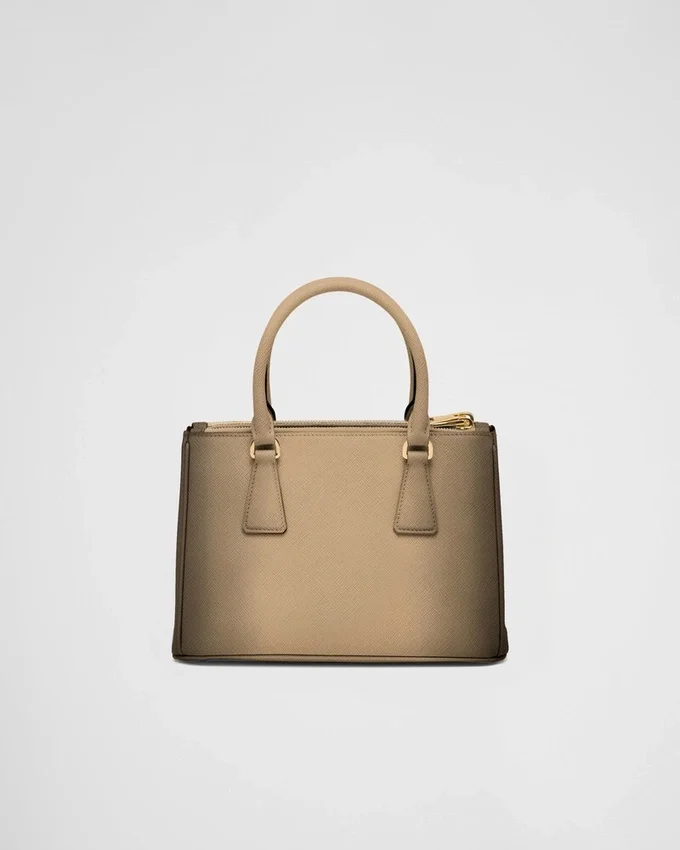 Prada Galleriaバッグの構造的なラインを備えた実用的なデザインは、手作業で施された特別なエアブラシ加工によってさらに際立っています。この加工は、マリオ・プラダが特許を取得した子牛革「Saffiano」で作られたバッグのシルエットを強調するものです。Saffianoは、傷や水に強く、クロスハッチのテクスチャーが特徴的です。 ラグジュアリーレザーグッズにおけるPradaの100年にわたる卓越性を体現するこのアクセサリーは、万華鏡のような現代性を解釈しようとするブランドのモダニティとスタイルのアイデンティティを映し出しています。「タイムレス」という概念を生み出した「Galleria バッグ」は、21世紀におけるPradaのアイデンティティの象徴となっています。