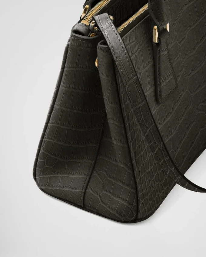 エレガントなスクエアスケールの上質なクロコダイルレザーに、魅惑的で極めて洗練された光沢感がアクセントを添えています。 完全に手作業で仕上げられた貴重なレザーが、このPrada Galleriaバッグを際立たせています。このバッグは、ブランドの時代を超えたエレガンスの真髄を表現しており、1913年にマリオ・プラダがミラノのヴィットーリオ・エマヌエーレ2世Galleriaにオープンした歴史的なプラダストアにちなんで名付けられました。 このアクセサリーは、ラグジュアリーレザーグッズにおけるPradaの100年にわたる卓越性を体現しており、実用的なデザインと構造的なラインを通じて、万華鏡のような現代性を解釈しようとするブランドの現代性とスタイルのアイデンティティを反映しています。