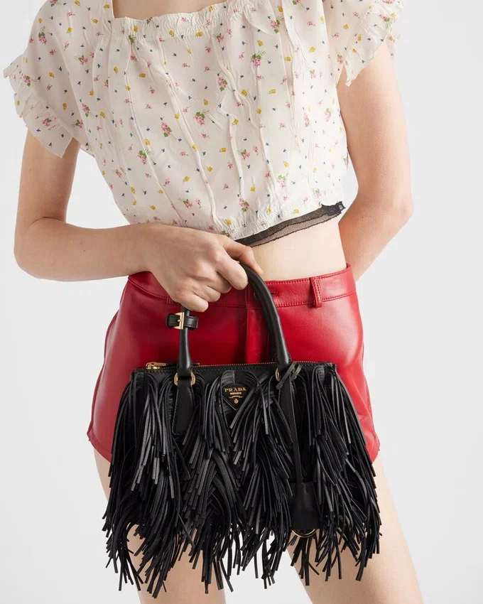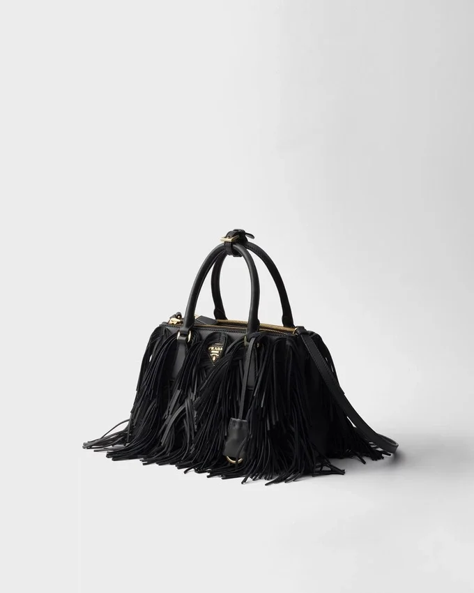 エレガントで時代を超越したデザインを持つPrada Galleria バッグは、Prada のアイデンティティの多面性を反映しています。この象徴的なスタイルは、職人の技が光る洗練されたディテールが施された、新しい縦長のシルエットで再解釈されています。前面と背面に施されたフリンジが、ダイナミックで現代的なアクセントを加え、このアクセサリーを完成させています。