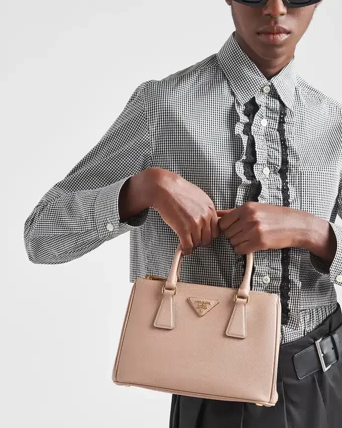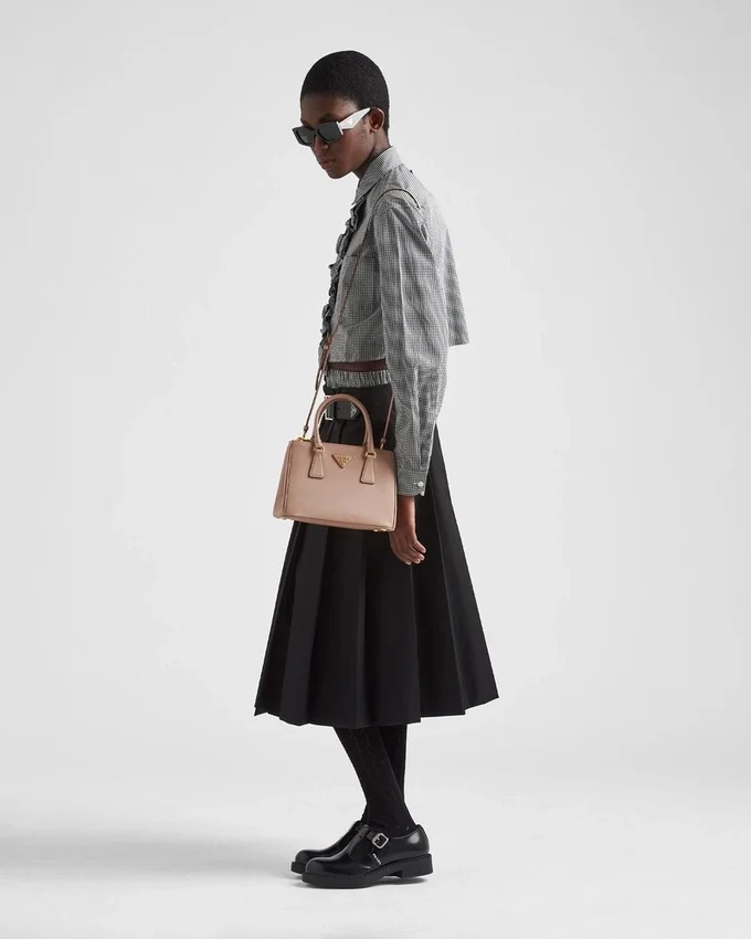Pradaの100年にわたる高級レザーグッズの卓越性を体現する「Prada Galleria バッグ」は、実用的なデザインと構造的なラインを通じて、万華鏡のような現代性を解釈しようとするブランドの現代性とスタイルのアイデンティティを反映しています。 スモールサイズで展開されるこのアクセサリーは、ブランドの創業者によって特許を取得された象徴的なSaffianoレザーを使用しており、クロスハッチのテクスチャーとワックス加工が特徴です。1913年にマリオ・プラダがミラノのヴィットーリオ・エマヌエーレ2世Galleriaにオープンした歴史的なプラダ店舗にちなんで名付けられた「Prada Galleria バッグ」は、ブランドの時代を超えたエレガンスの真髄を表現しています。