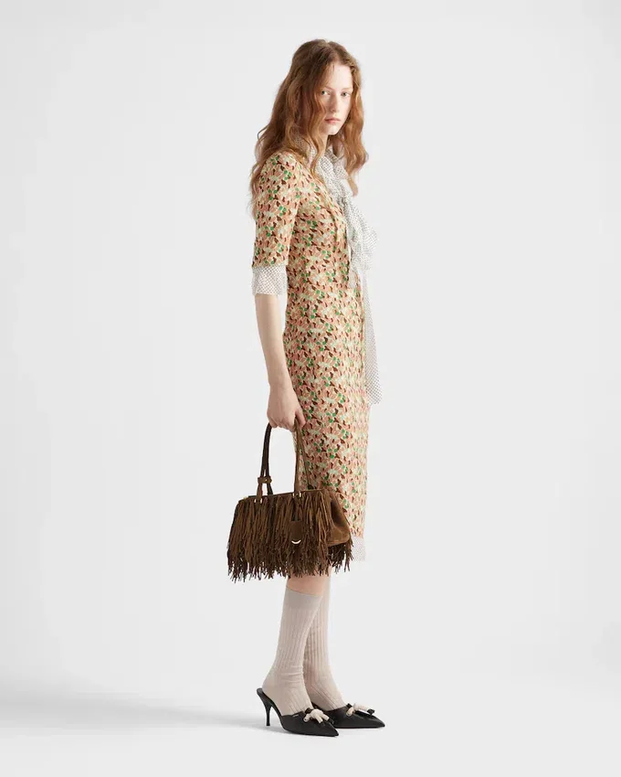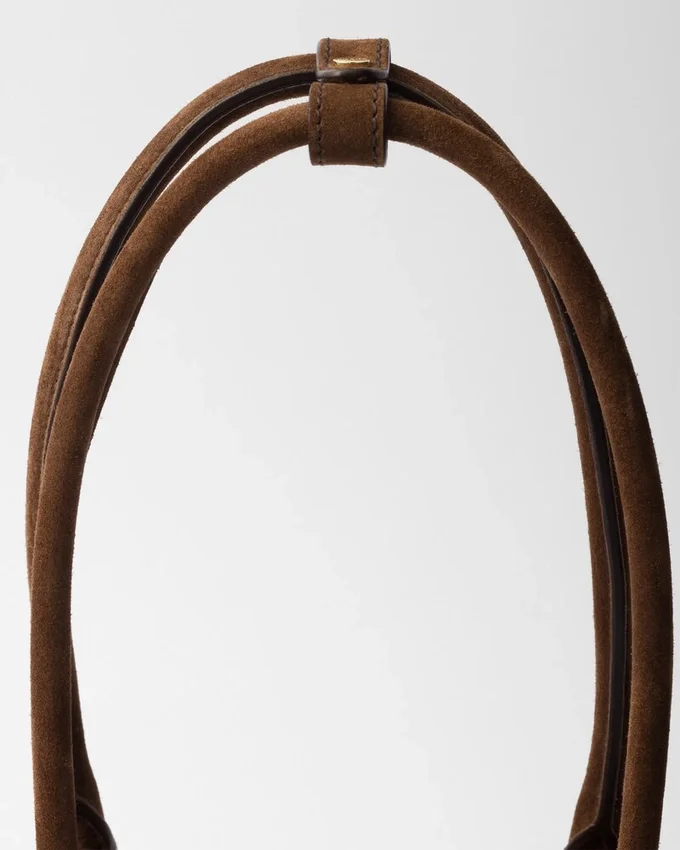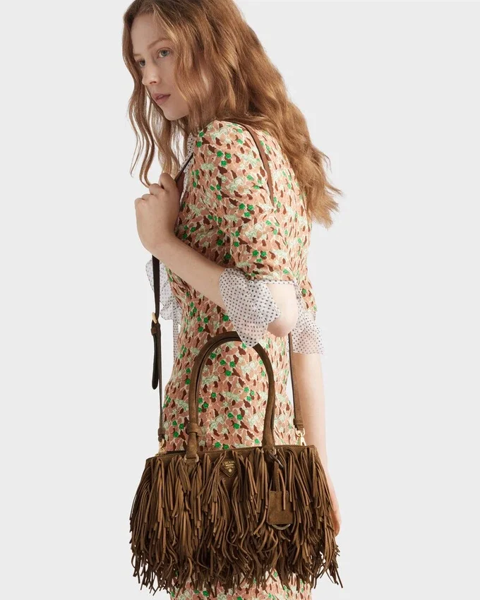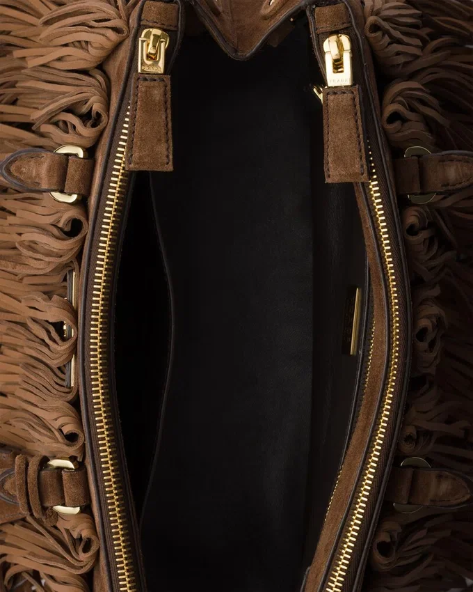 エレガントで時代を超えたデザインを持つPrada Galleria バッグは、Prada のアイデンティティの多面性を反映しています。この象徴的なスタイルは、スエード素材によって強調された新しい縦長のシルエットが特徴です。前面と背面に施されたフリンジが、ダイナミックで現代的なアクセントを加え、このアクセサリーを完成させています。