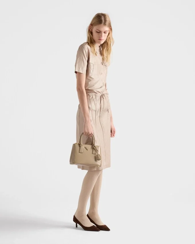 Prada Galleria バッグは、その時代を超越したシルエットをさらに引き立てる新たな解釈により、毎シーズン新たな魅力を放ちます。スモールサイズで登場したこのアクセサリーは、パテント加工を施した Saffiano レザーのエレガントな仕上げにより、アイコニックなスタイルに洗練された魅力を添えています。