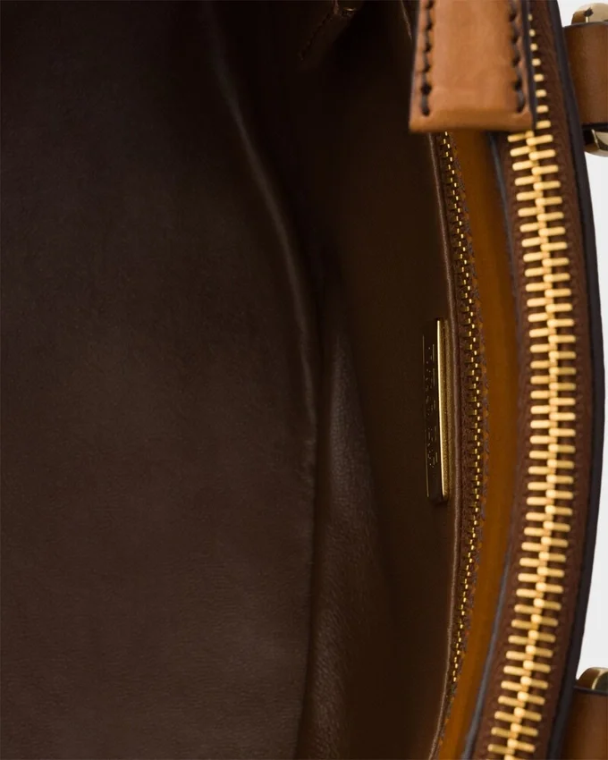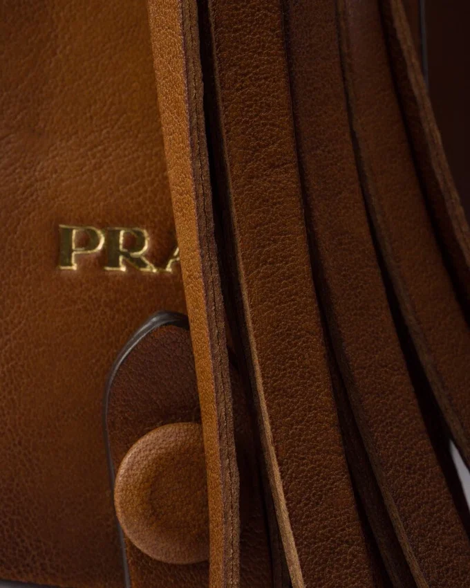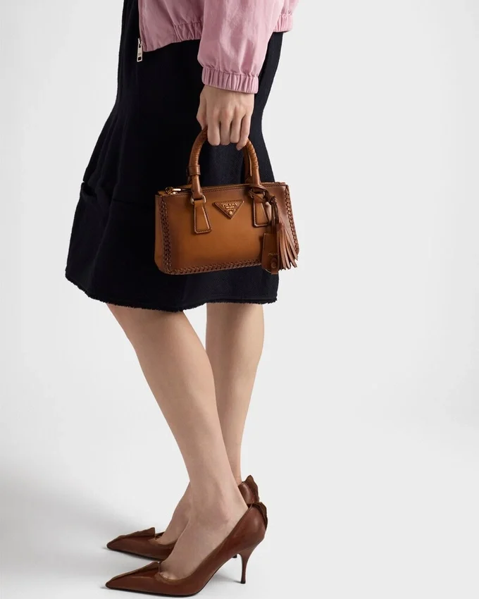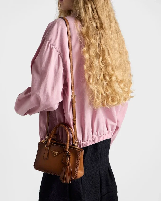 Prada Galleria バッグは、洗練されたシルエットとウエスタンスタイルの大胆な要素を融合させたハイブリッドなデザインで再解釈されています。 洗練されたミニサイズで登場したこのアクセサリーは、グラデーション加工を施したレザーを使用し、デザインの縁を縁取るレザーステッチで装飾されています。新しい素材と洗練された職人技によって常に新たな発見をもたらすこのアイコンは、その多面的で時代を超えた本質を明らかにしています。