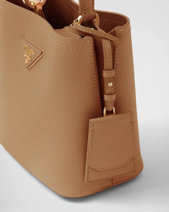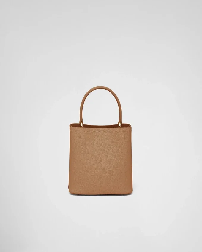 Saffianoレザーの象徴的な質感が、コンパクトなPrada Panierバッグの特徴です。シングルハンドルのエレガントなデザインは、上部のストラップ留めが際立っています。