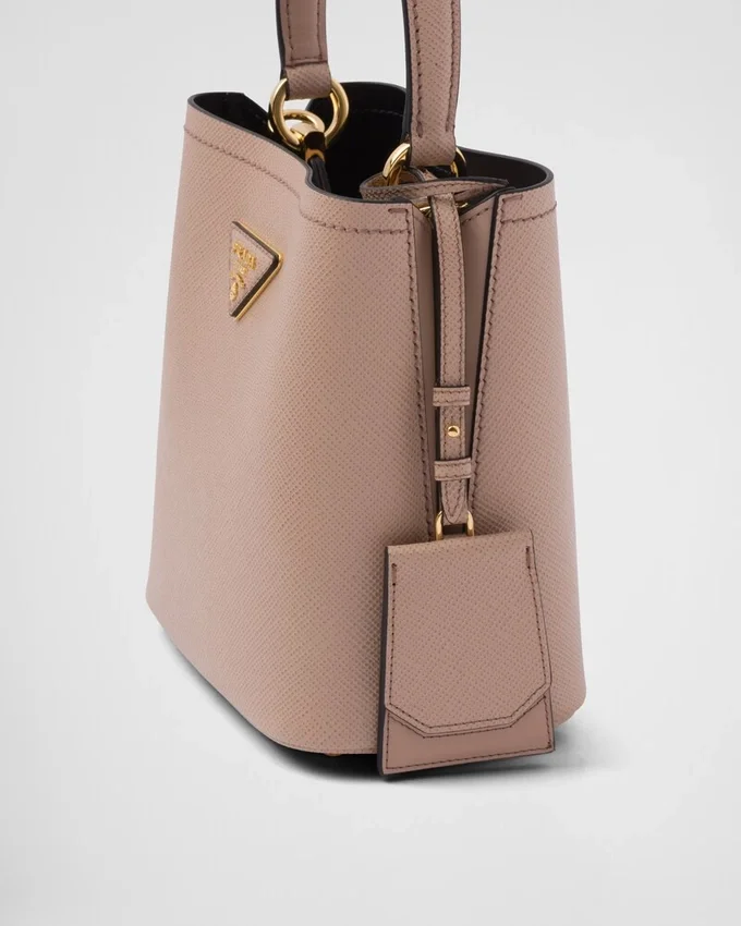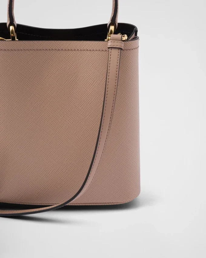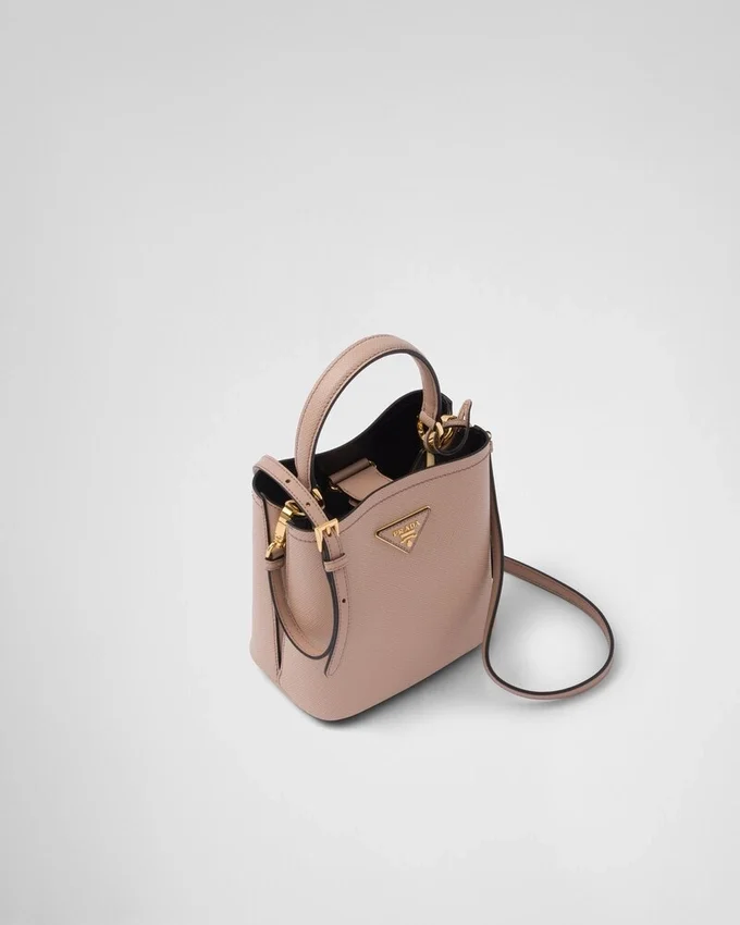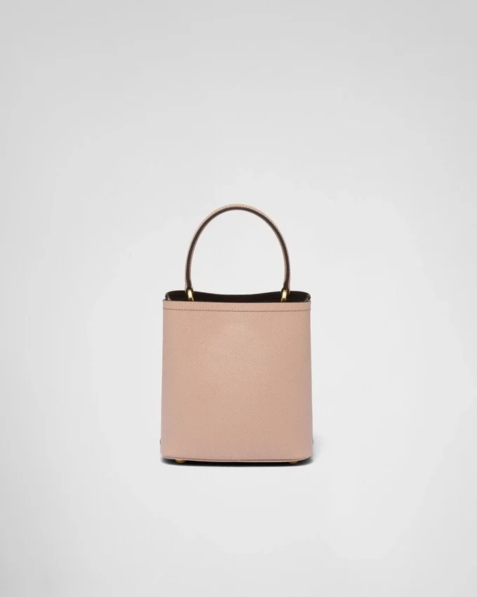 コンパクトなPrada Panierバッグは、Saffianoレザーの象徴的な質感が特徴です。シングルハンドルのエレガントなデザインは、上部のストラップ留めが際立っています。