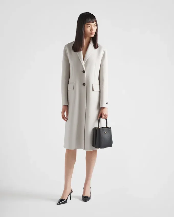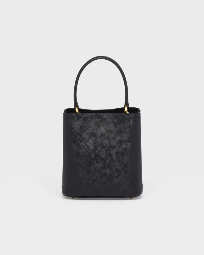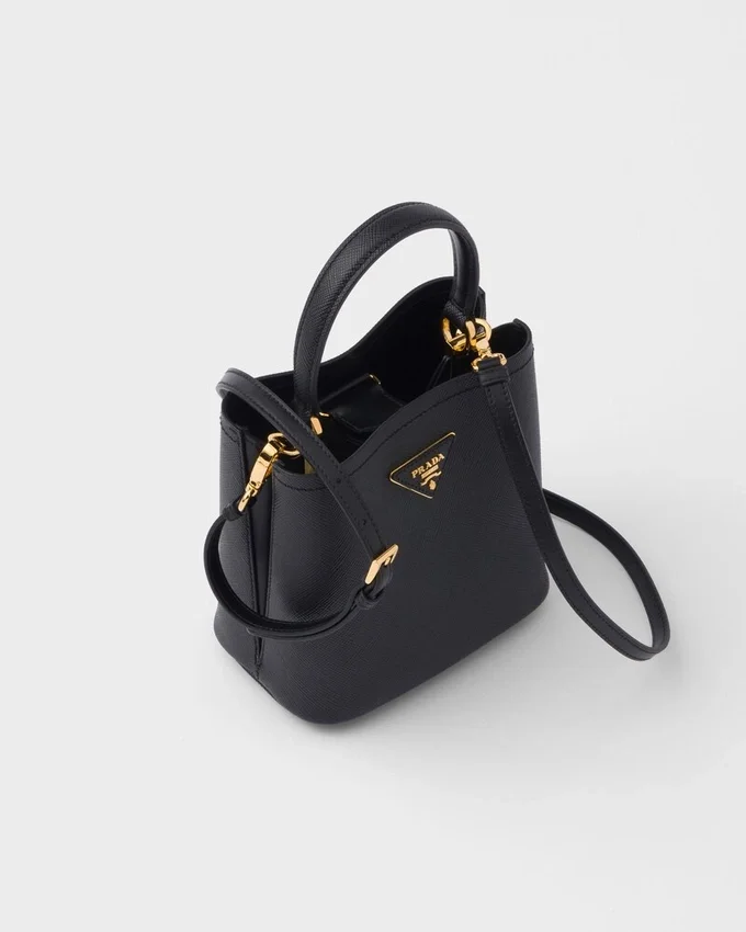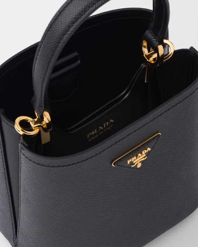 コンパクトなPrada Panier バッグは、Saffiano レザーの象徴的な質感が特徴です。シングルハンドルのエレガントなデザインは、上部のストラップ留めが際立っています。