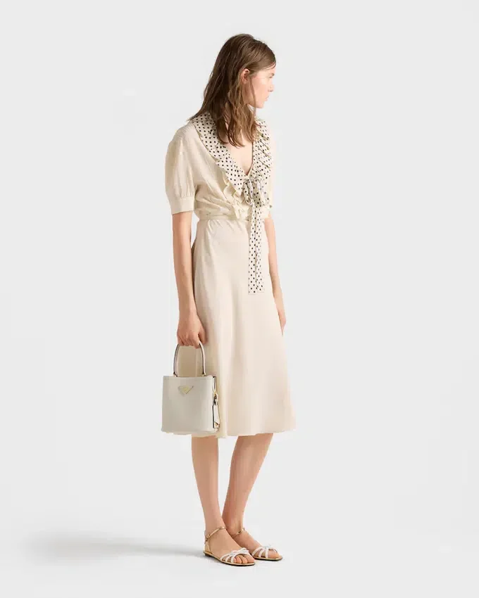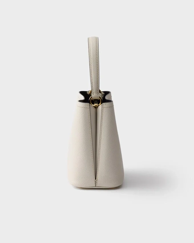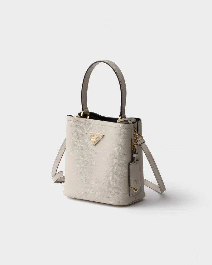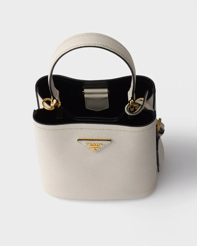 Prada Panier バッグの洗練された幾何学的なシルエットが、コンパクトで上品なミニバージョンとして再解釈されました。Prada コレクションの象徴的な素材である Saffiano レザーで作られたこのアクセサリーは、職人の卓越した技を表現する洗練されたディテールで彩られています。