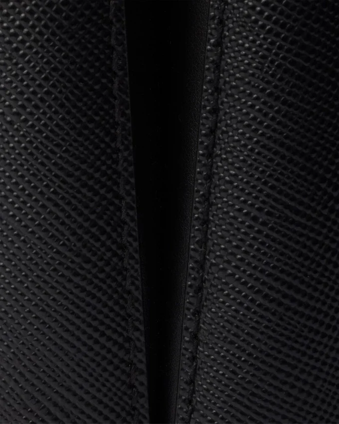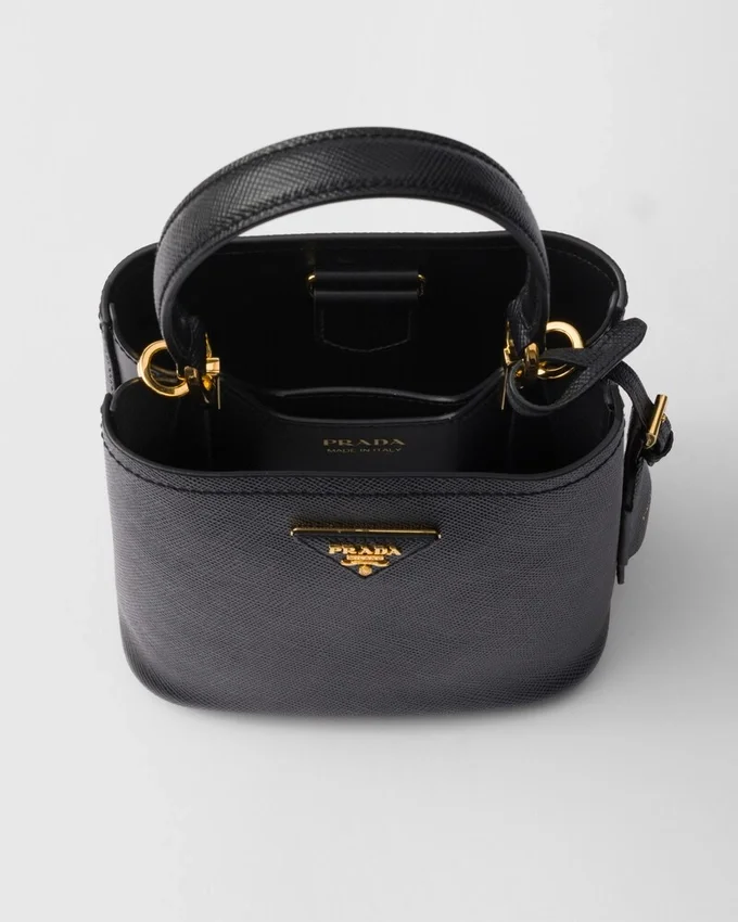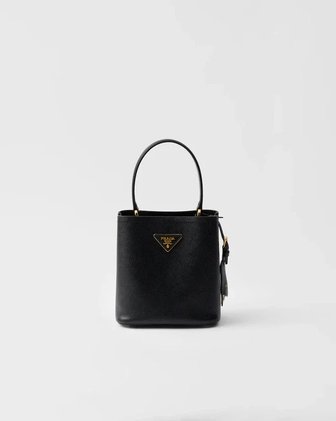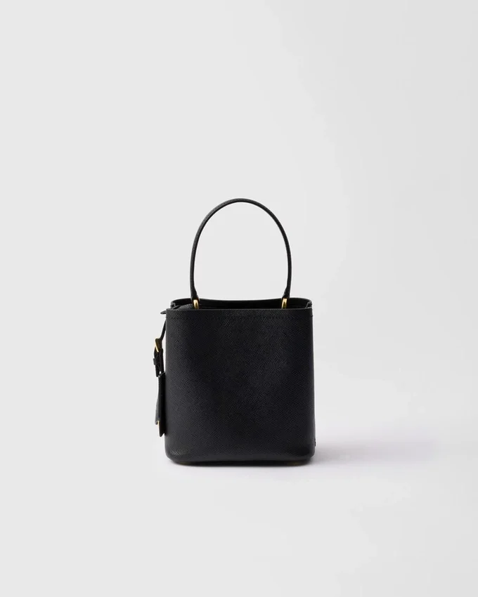Prada Panier バッグの洗練された幾何学的なシルエットが、コンパクトで洗練されたミニバージョンとして再解釈されました。Prada コレクションの象徴的な素材である Saffiano レザーで作られたこのアクセサリーは、職人の卓越した技を表す洗練されたディテールで彩られています。